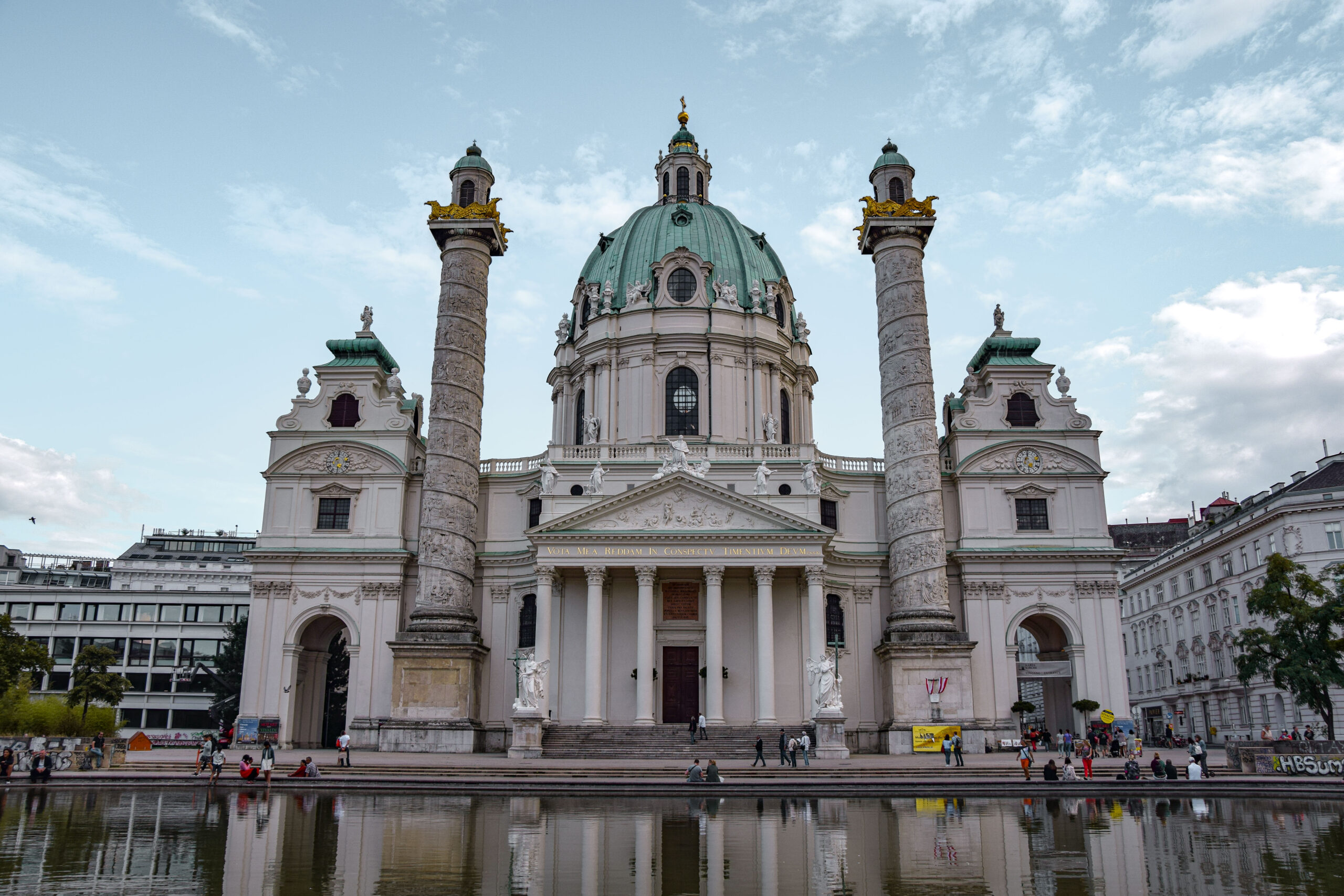 Considérée comme la plus belle église baroque de Vienne, l’église Saint-Charles de Borromée, toute de blanc vêtue, se reflète magnifiquement dans son miroir d’eau. Le prix d’entrée pour la visite (8 € par adulte) inclut également la montée par ascenseur jusqu’au dôme pour une belle vue sur Vienne.