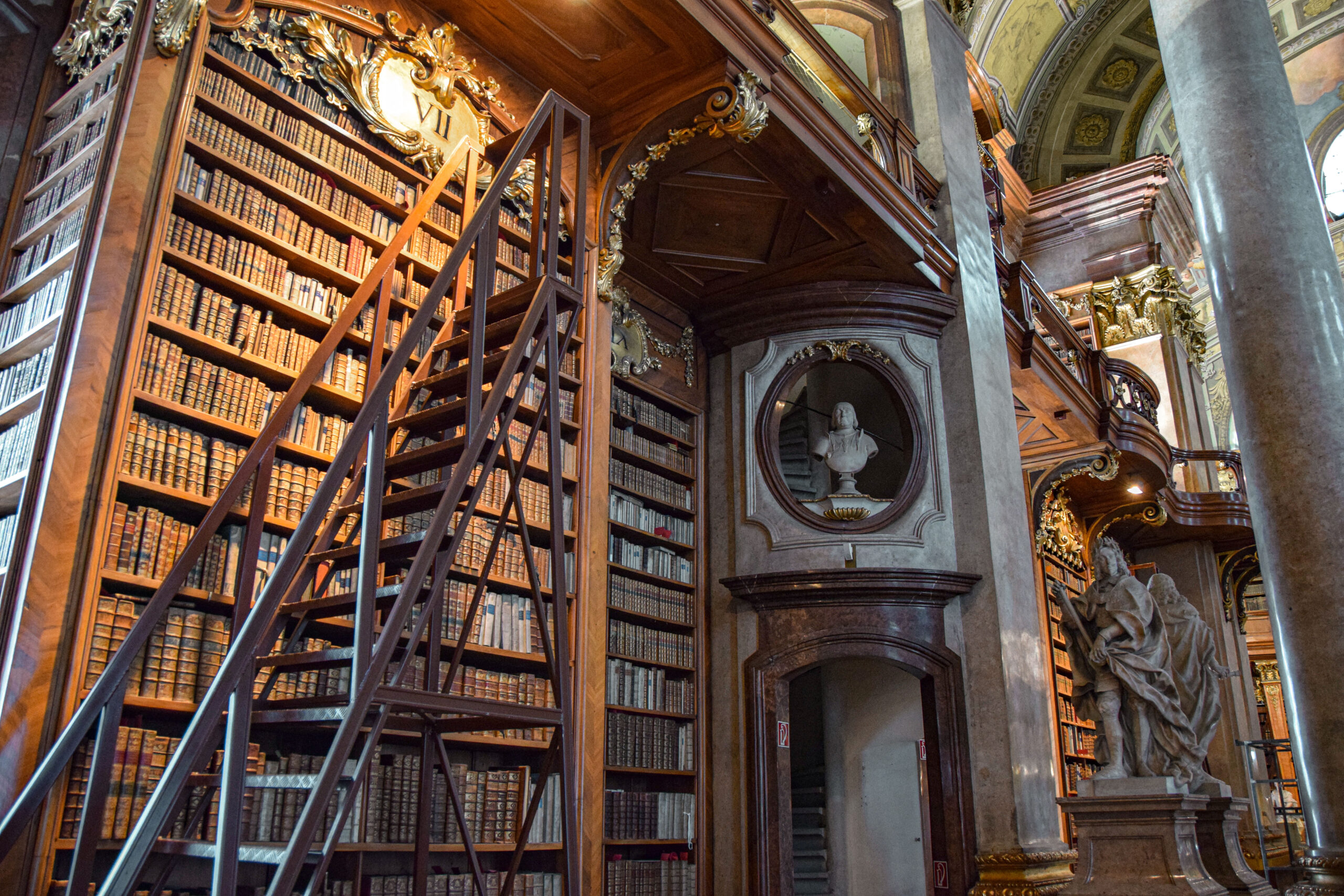 L’attrait principal de la Bibliothèque Nationale autrichienne est la salle d’apparat construite par Johann Bernhard Fischer von Erlach, à qui l’on doit également le château de Schönbrunn. Nous voilà donc dans l’une des plus belles bibliothèques baroques d’Europe qui n’est pas sans me rappeler celle de Strahov à Prague. Renfermant quelque 200 000 livres, la salle d’apparat expose aussi des fresques et des statues de ceux qui ont marqué l’histoire de l’Autriche.