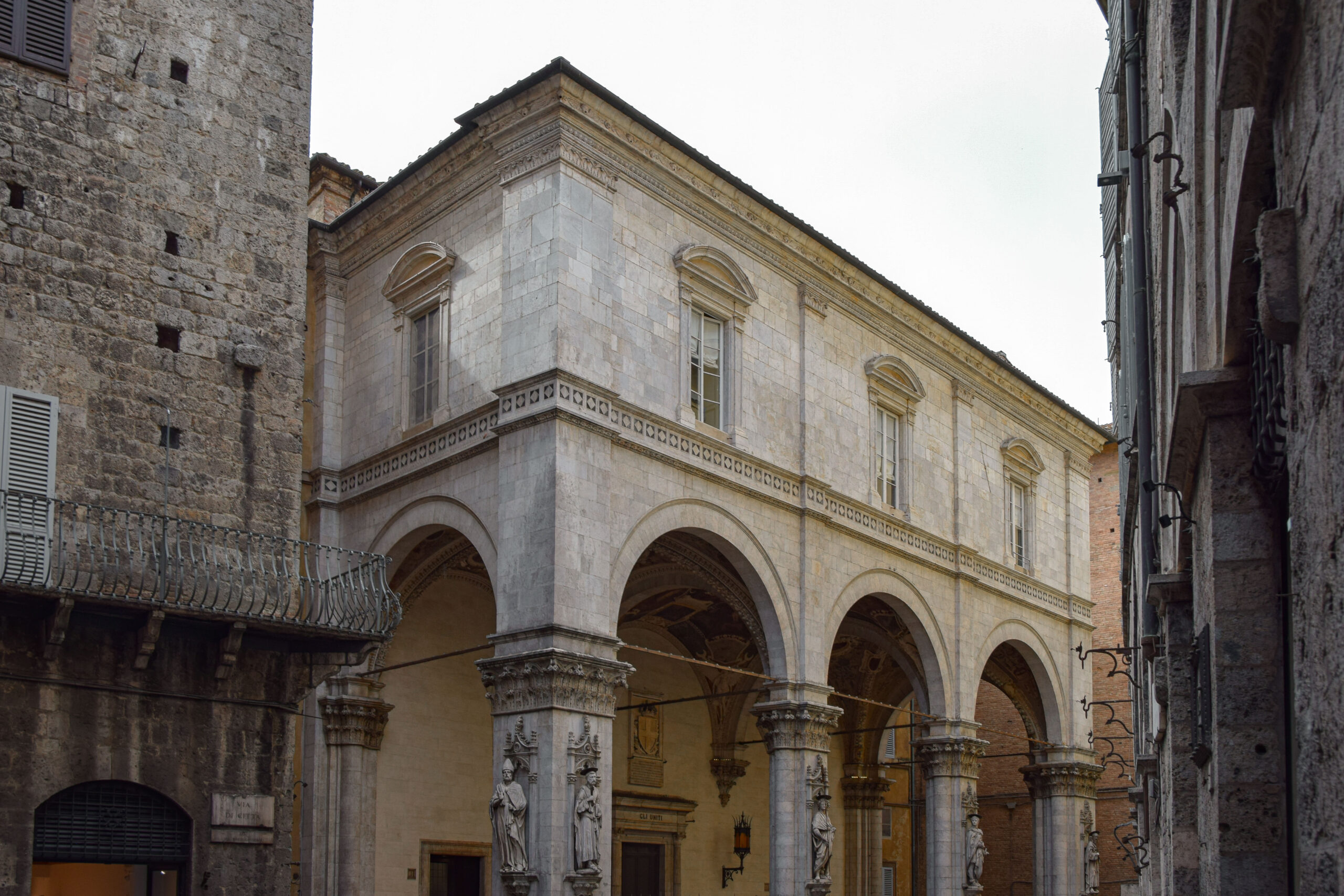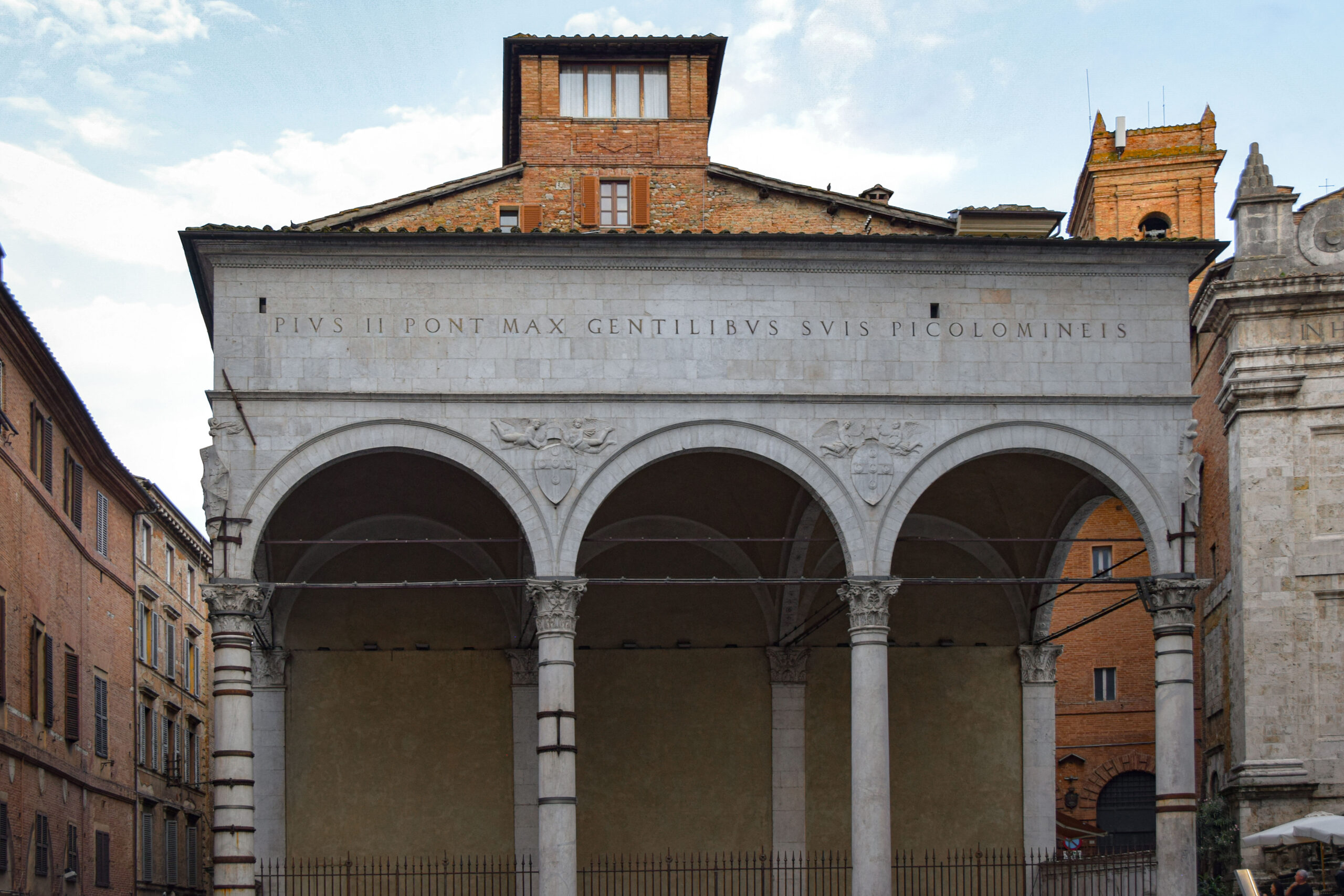 Dans le centre historique, nous tombons au fil de notre déambulation devant les Logge del Papa et Logge della Mercanzia, témoins de raffinement de Sienne durant la Renaissance. La Logge del Papa, commandée par le pape Pie II pour honorer sa famille Piccolomini, est un lieu de rencontre avec des arcades ouvertes qui illustrent la noblesse et le classicisme de l’architecture siennoise. À proximité, la Logge della Mercanzia, un autre espace couvert et décoré de sculptures, servait de lieu de réunion pour les commerçants de la ville. Ces loges incarnent ainsi l’importance du commerce et de la diplomatie dans l’histoire de Sienne.
