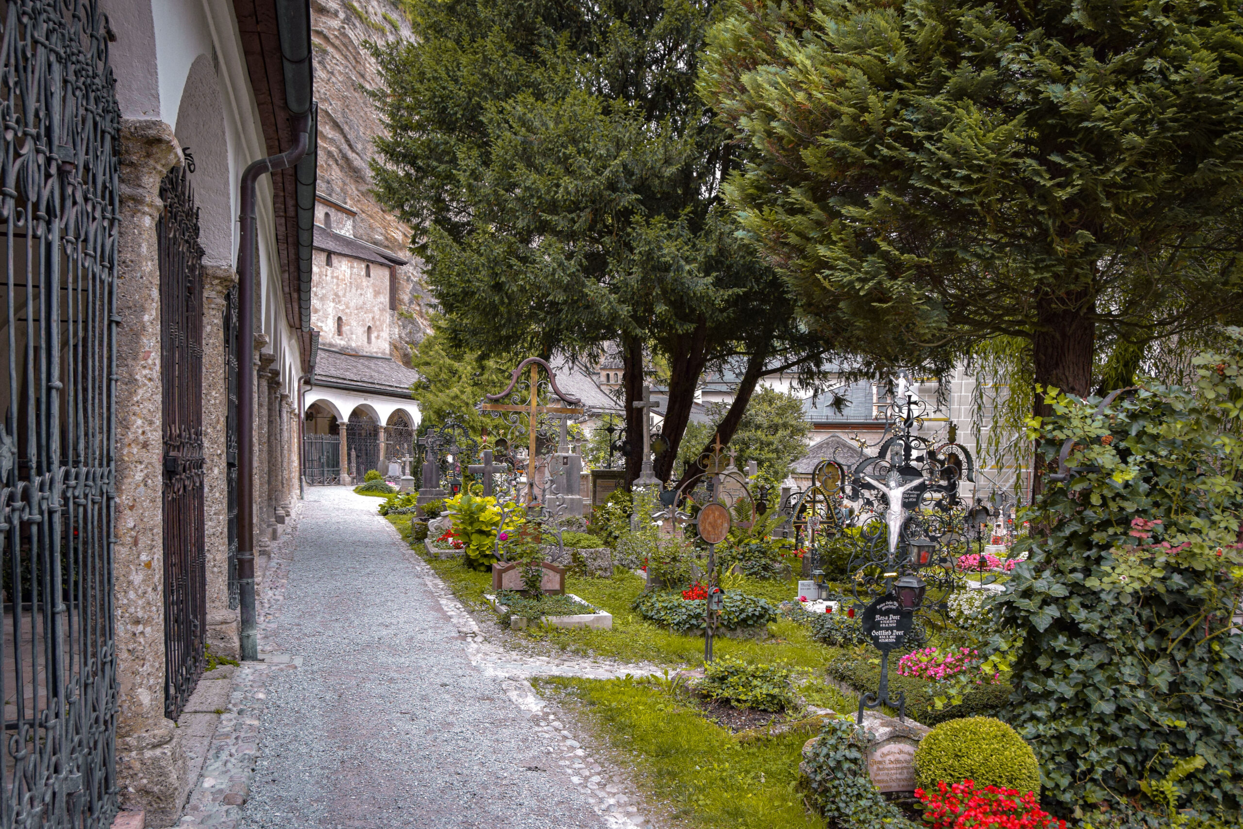 Une fois la visite terminée, il est temps de rejoindre la Festungsgasse qui me conduit au pied de l’abbaye de Saint Pierre et son cimetière. Chose étrange à dire mais pourtant vraie, le cimetière Saint-Pierre est l’un des plus beaux cimetières au monde. Des chapelles richement ornées et des pierres tombales fleuries composent ce cimetière où repose entre autres la sœur de Mozart. Depuis le cimetière, il est possible d’accéder aux catacombes et une visite de l’église Saint-Pierre, rénovée dans un style baroque, permet d’observer son intérieur de style rococo. Située au cœur de Salzbourg, l’abbaye de Saint-Pierre est la plus ancienne abbaye des pays germanophones.