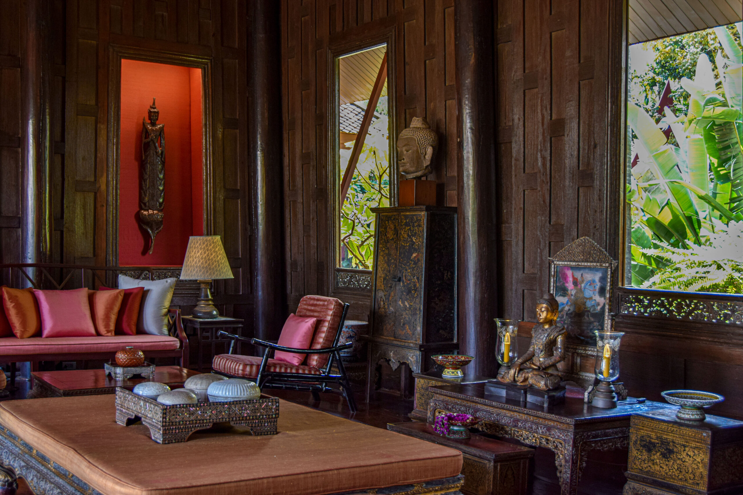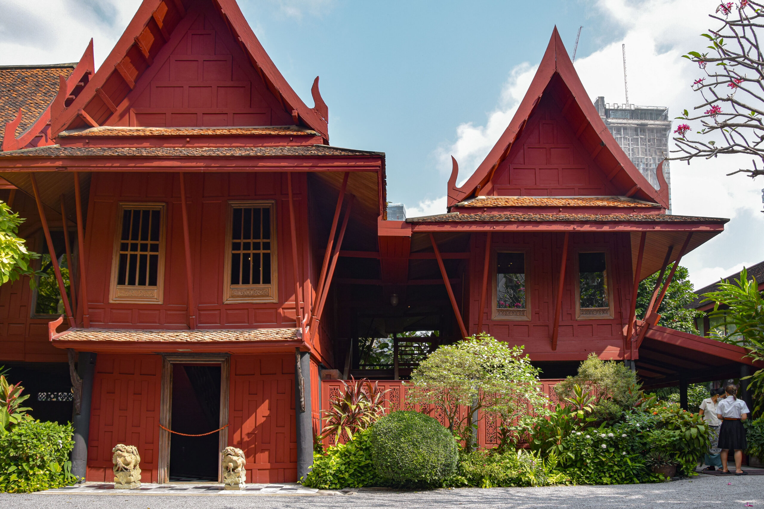 Pour cela, il fait démonter puis ré-assembler six maisons traditionnelles en teck en provenance d’Ayutthaya au nord de Bangkok. Cette grande maison suit ainsi à la lettre les règles de construction des habitations thaï (sur pilotis, toiture à la technique ancestrale, murs peints en rouge…). Il agrémente également les différentes pièces d’objets d’arts puis emménage en 1959. Il ouvrira sa maison au public quelque temps après. En 1967, Jim Thompson disparaît mystérieusement en Malaisie et on ne retrouvera jamais aucun indice sur les causes de sa disparition et de sa mort. Sa maison restera intacte, comme un hommage à son attachement à la Thaïlande. Elle est aujourd’hui un des lieux les plus visités de Bangkok. De nombreuses autres anecdotes sur sa vie et sa maison sont racontées lors des visites guidées.