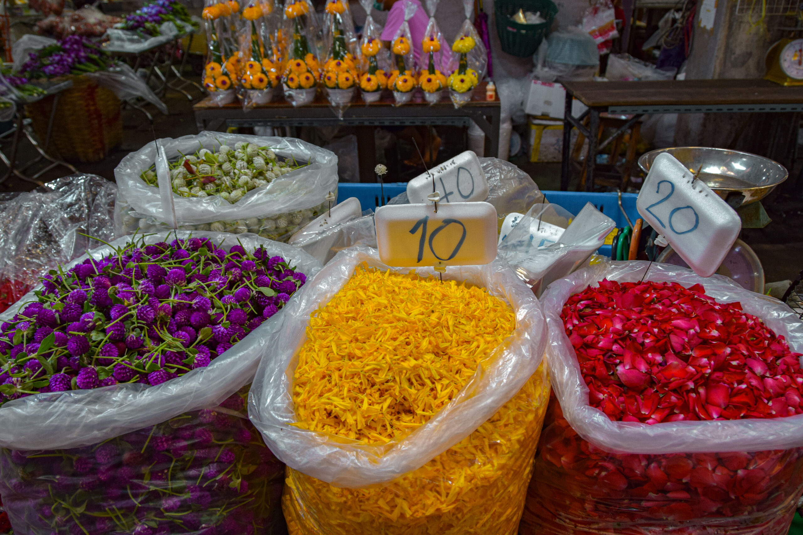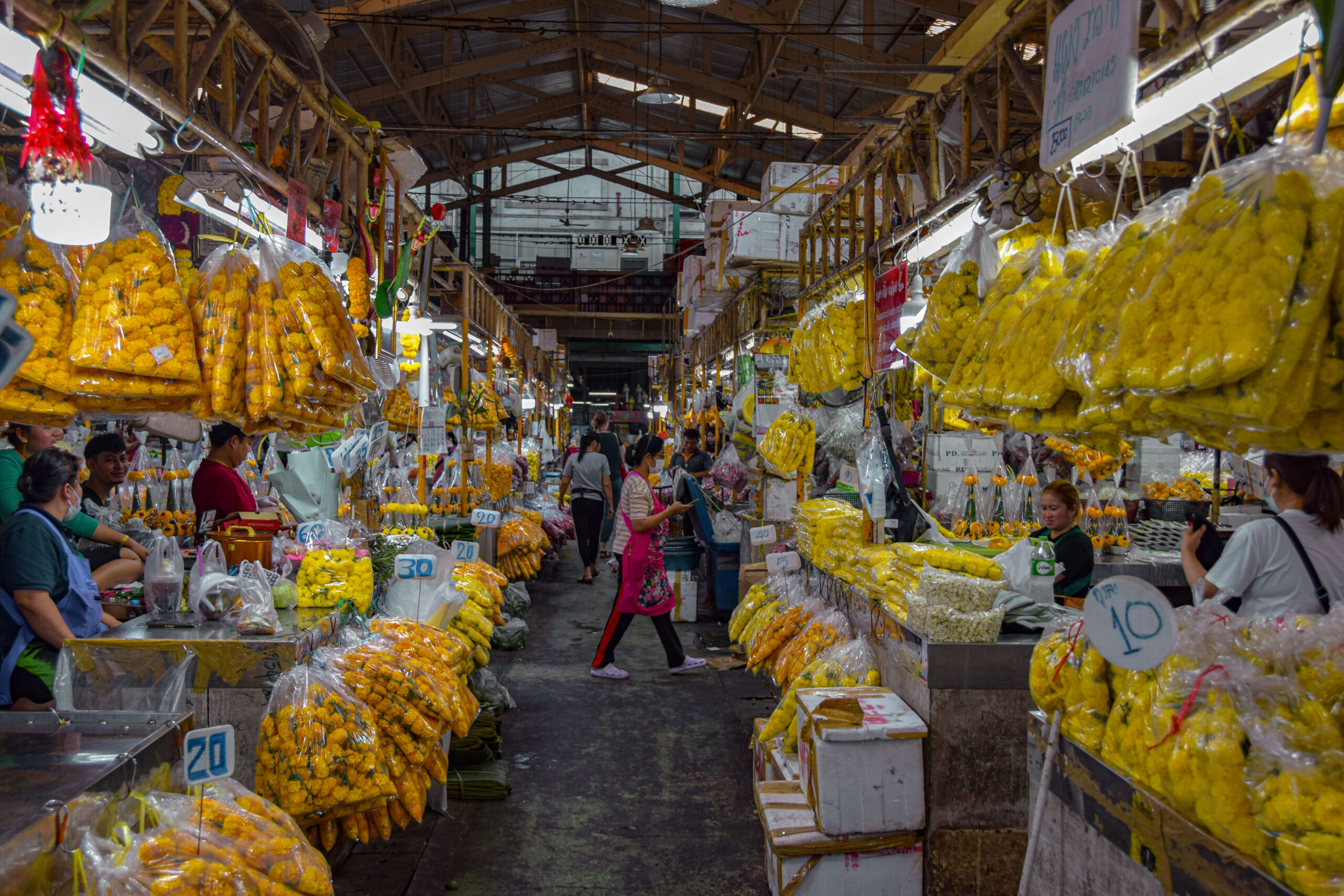 Au bord de la rivière Chao Phraya, le Pak Khlong Talat est le plus grand marché aux fleurs fraîches de Thaïlande. C’est surtout une expérience très locale de déambuler parmi les étals de fleurs, de fruits et de légumes dans une ambiance agitée voire parfois chaotique. Il parait qu’il prend une toute autre dimension une fois la nuit tombée, pour ma part, je l’ai visité l’après-midi. Le marché aux fleurs est situé non loin du Wat Pho et de Chinatown facilement accessible depuis la station de métro MRT Sanam Chai (ligne bleue) ou par la rivière depuis l’embarcadère Rajinee.