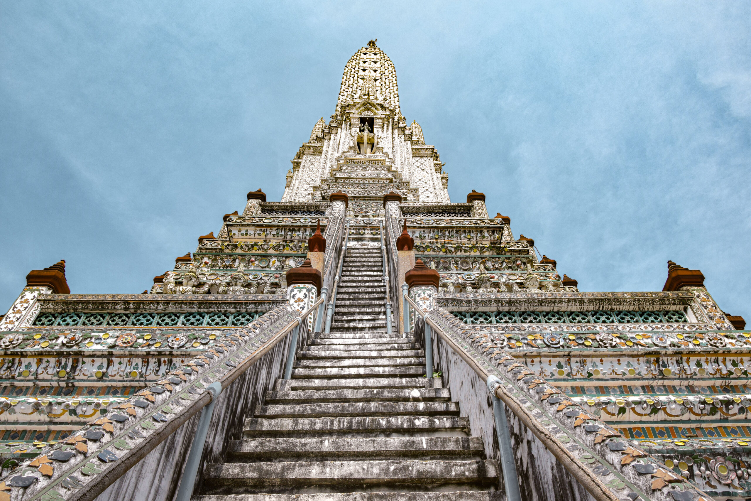 Sur la rive est de la rivière Chao Phraya, se dresse le Wat Arun aussi appelé temple de l’Aurore. L’aspect extérieur du Wat Arun est unique grâce à la tour centrale (dit Prang) de 82 mètres construite dans la tradition du style khmer et entourée de quatre autres Prangs plus petits. Un escalier permet d’ailleurs d’accéder au sommet de la tour principale.