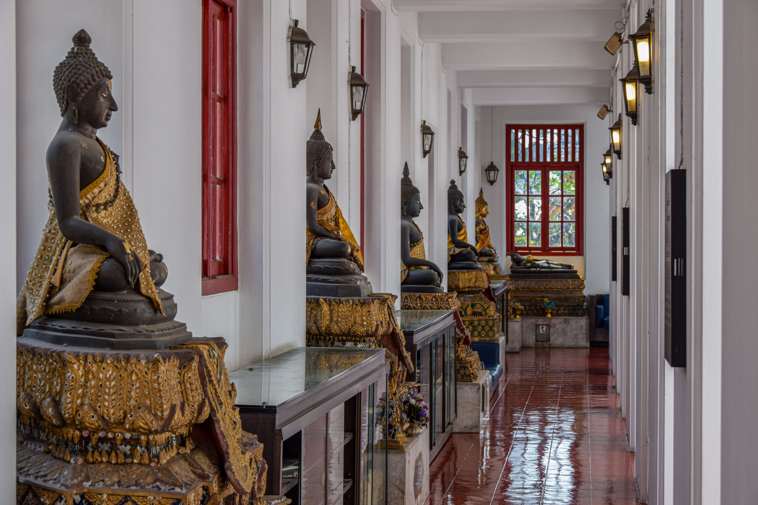 Dans le both (sanctuaire principal), on retrouve une galerie de bouddha assis mais également un autre bouddha plus grand qui siège au-dessus des cendres du roi Rama II.