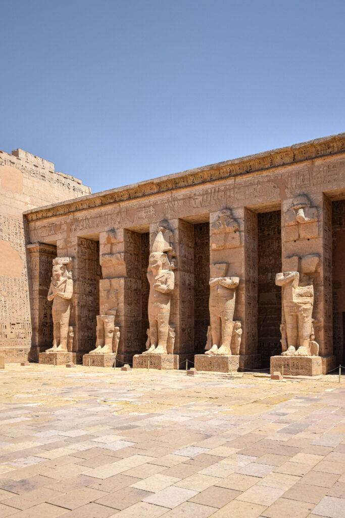 À quelques kilomètres, le temple de Médinet Habou, funéraire de Ramsès III, constitue notre prochain arrêt de la journée. Ses murs portent les récits de batailles victorieuses contre les Peuples de la mer.