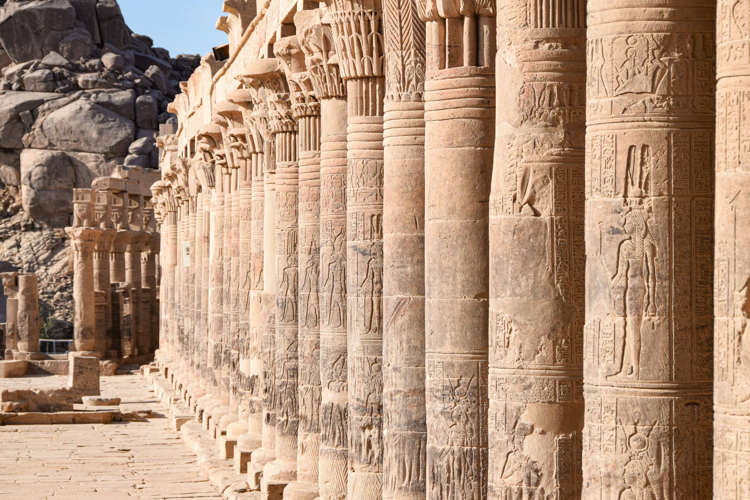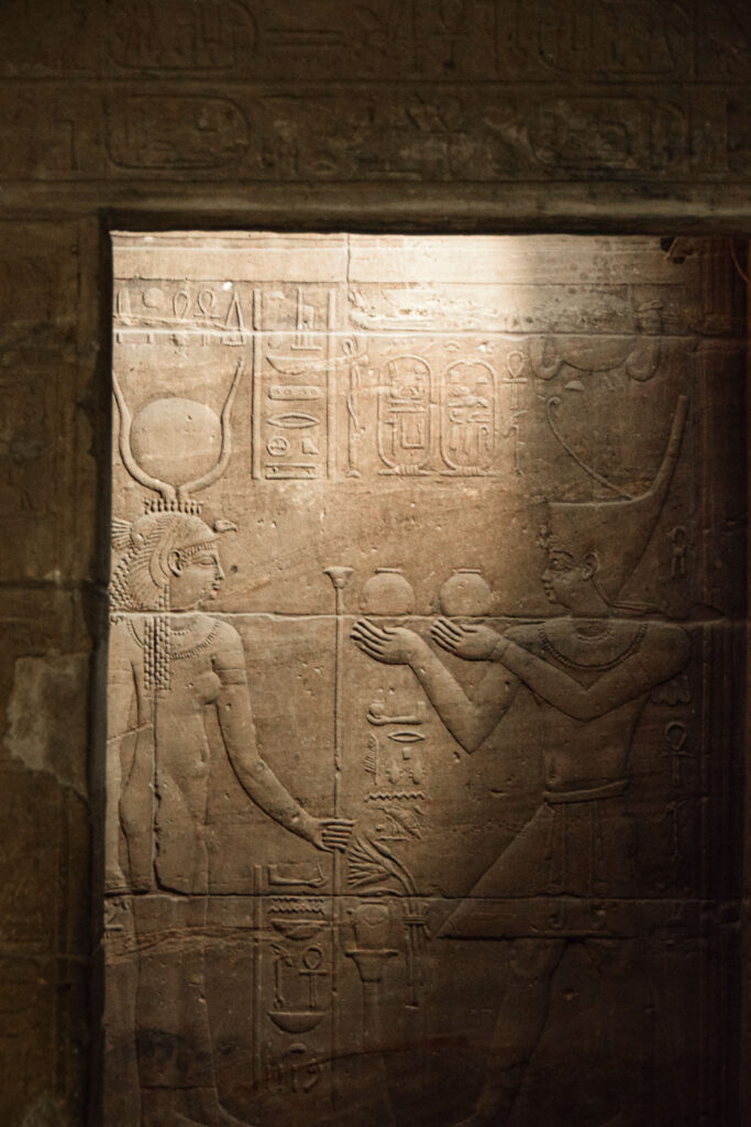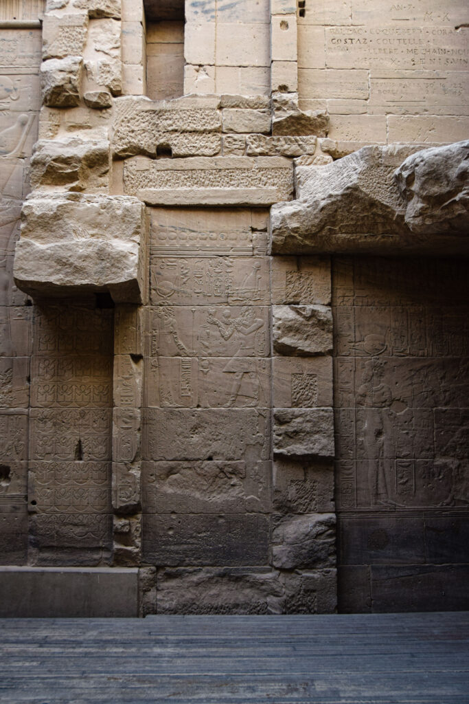 L’architecture témoigne de cette époque tardive : colonnes élégantes, pylônes massifs, cours à ciel ouvert et chapelles décorées de scènes rituelles où Isis reçoit les offrandes des pharaons et des empereurs romains, venus affirmer leur légitimité en se plaçant sous la protection de la déesse.