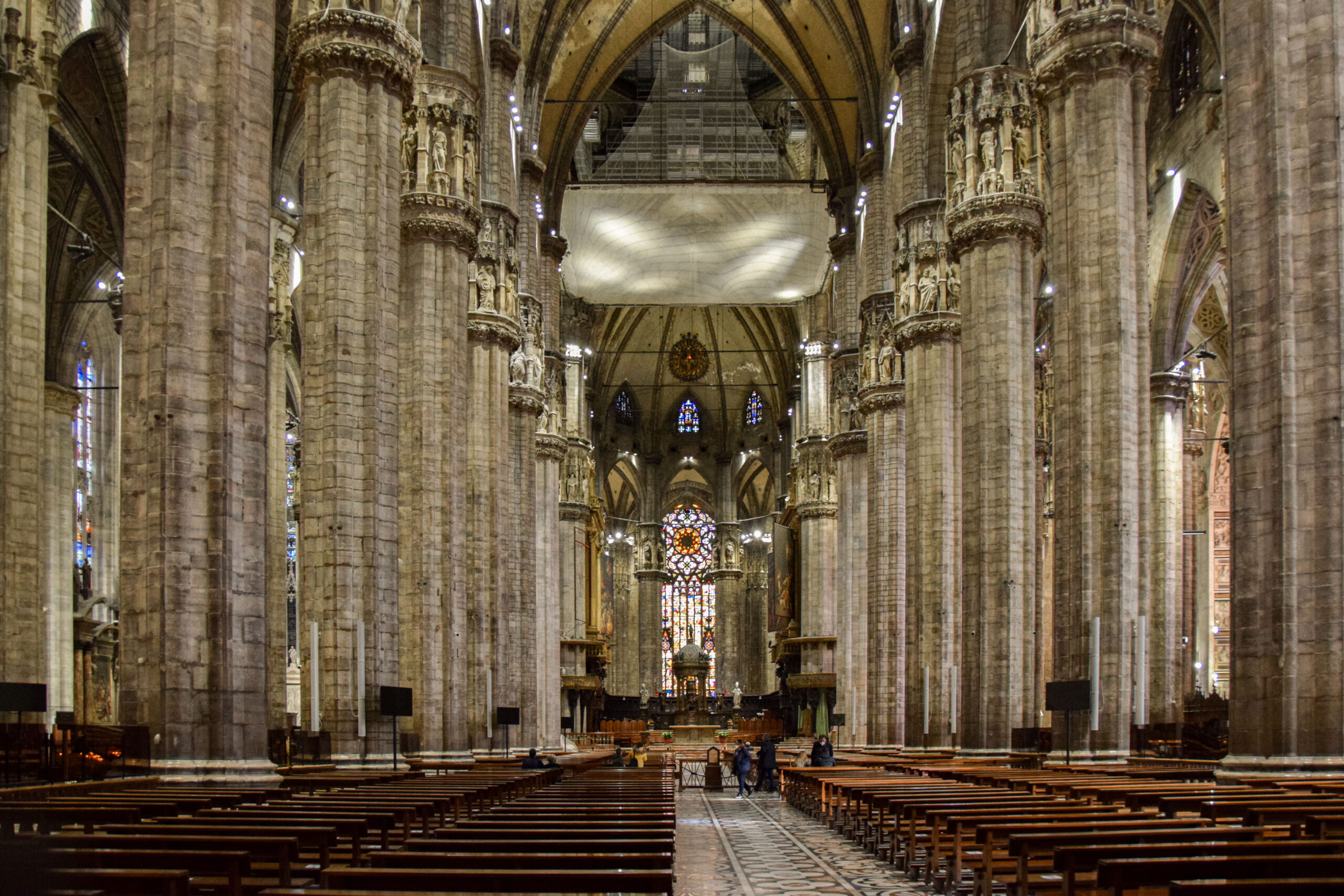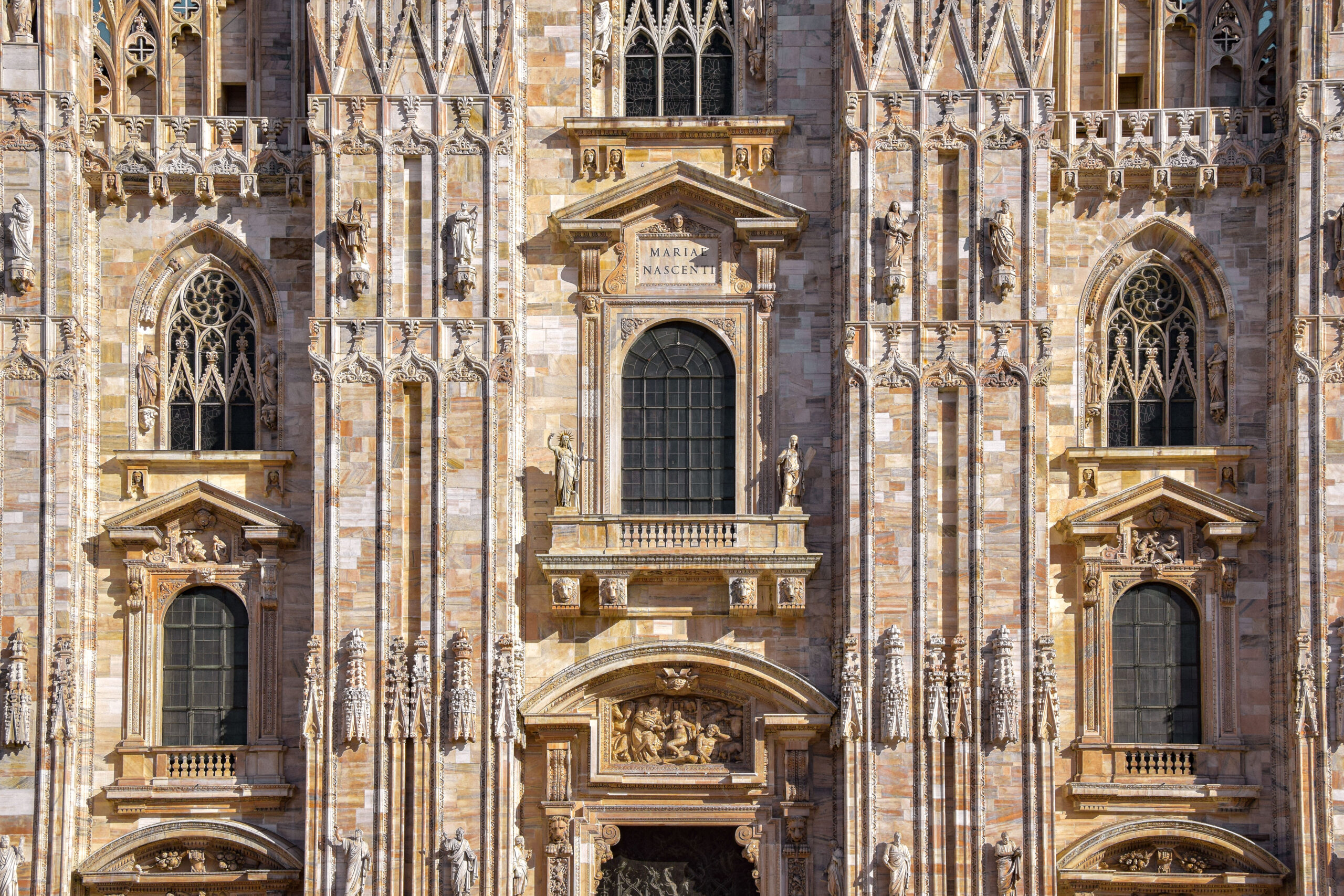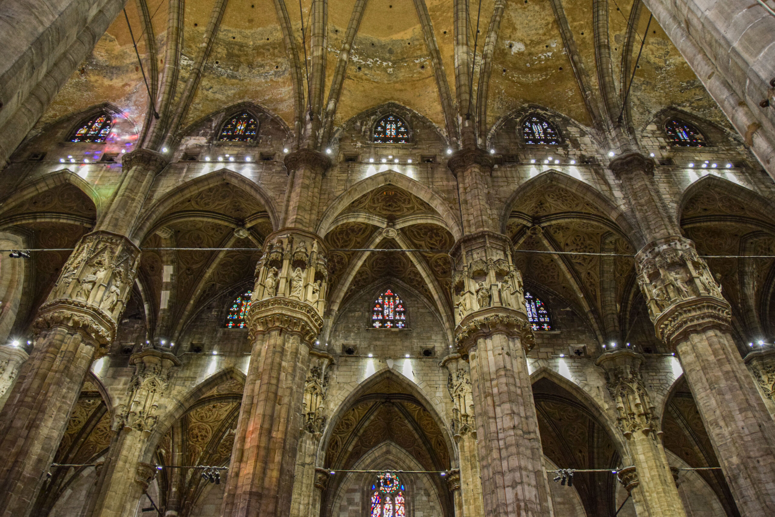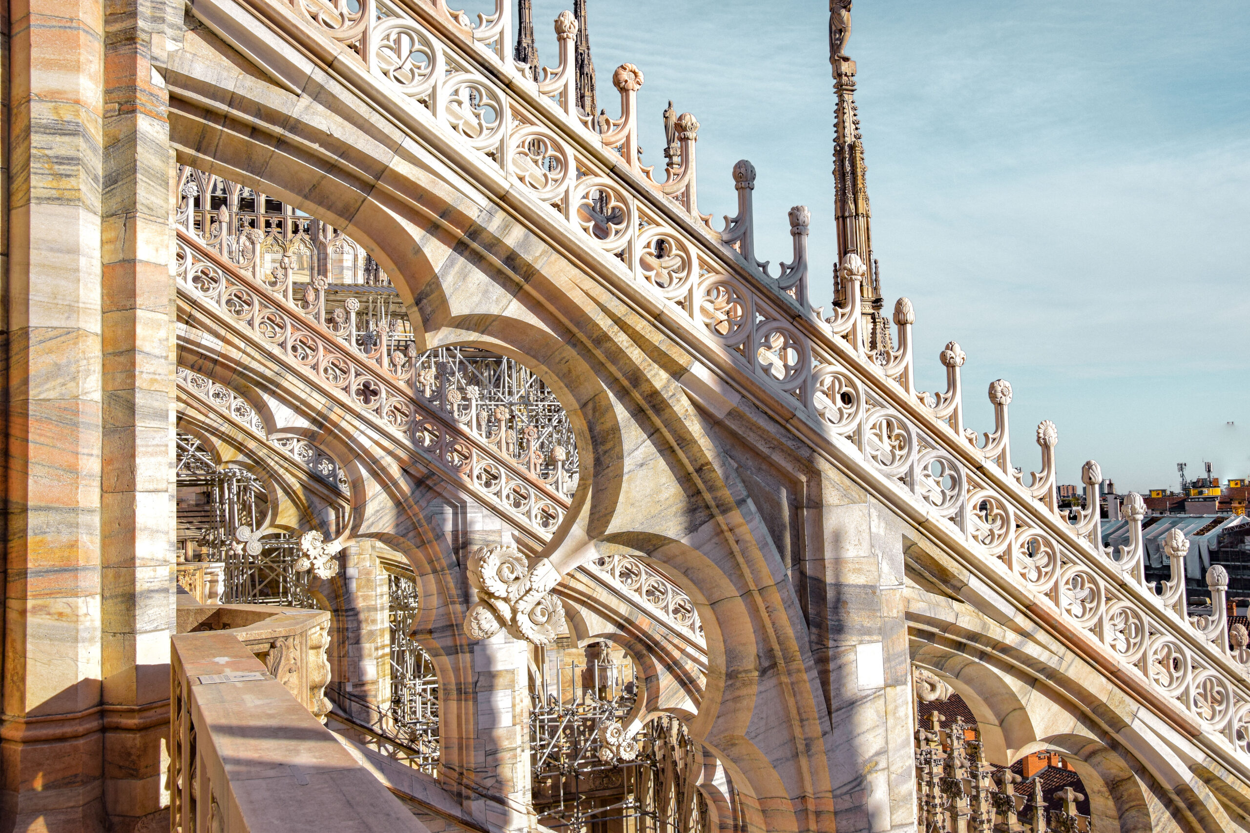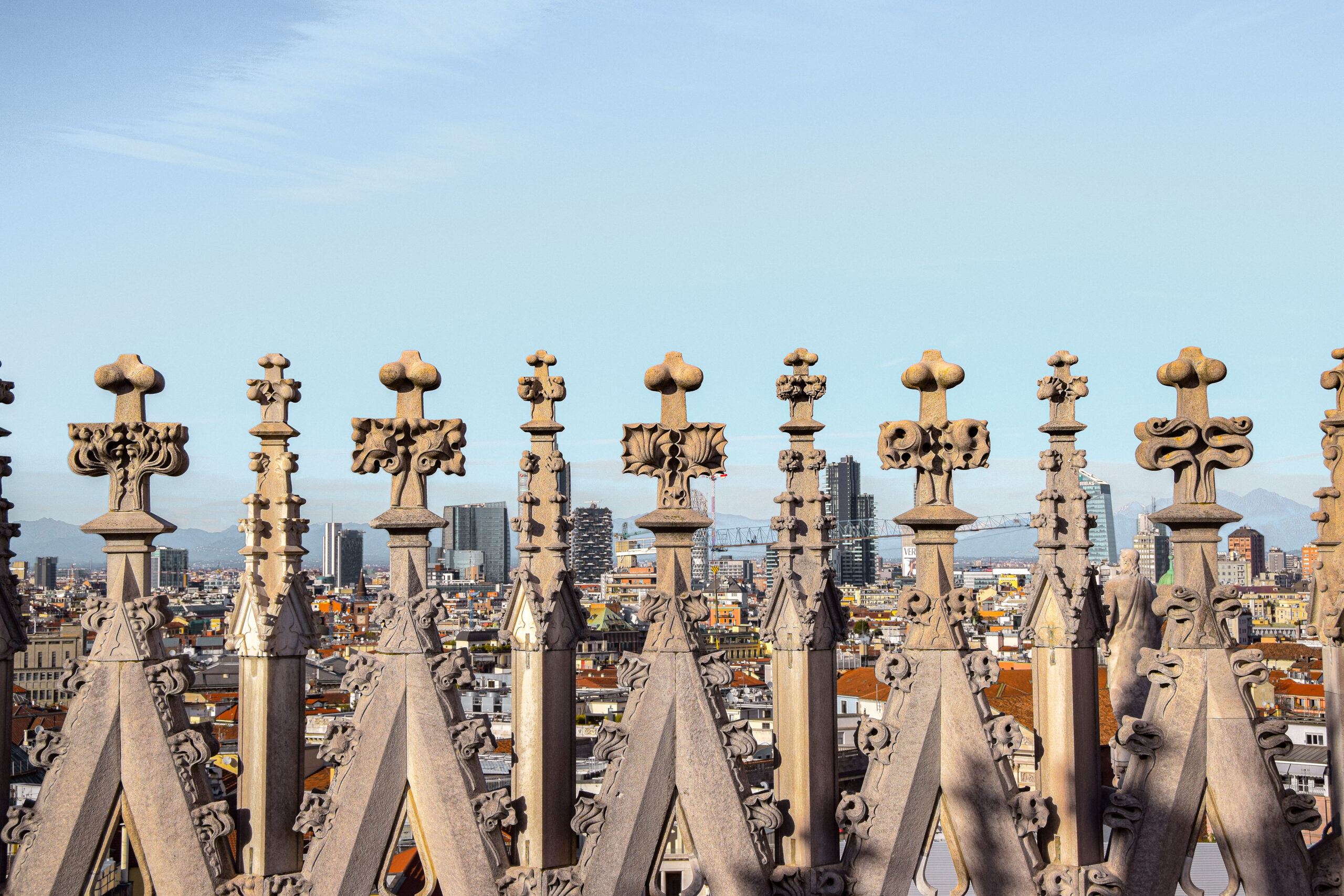La cathédrale est surmontée de 135 flèches et autant de détails que l’on peut observer de plus près depuis le toit-terrasse accessible à pied (170 marches) ou par ascenseur. Les terrasses permettent aussi d’avoir une vue incroyable sur tout Milan avec pour toile de fond les Alpes.