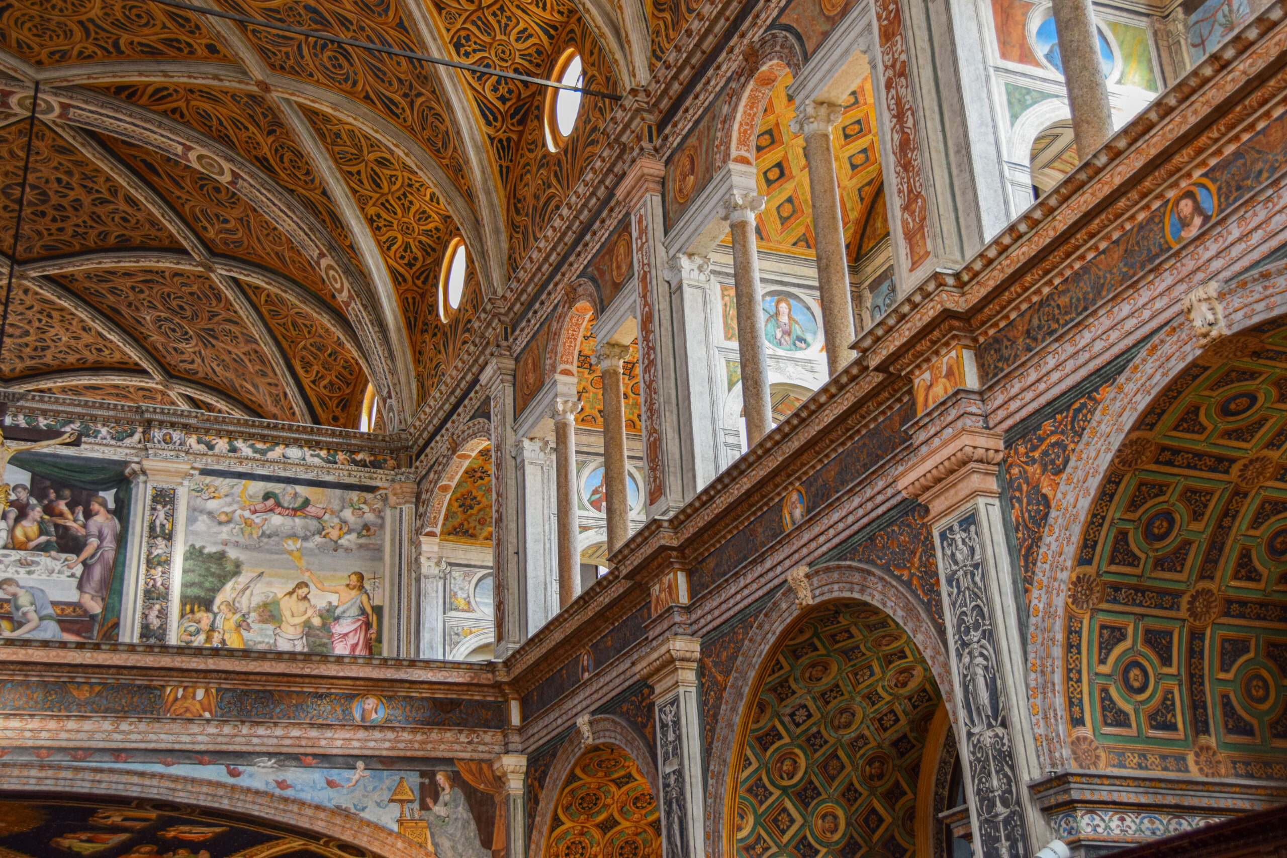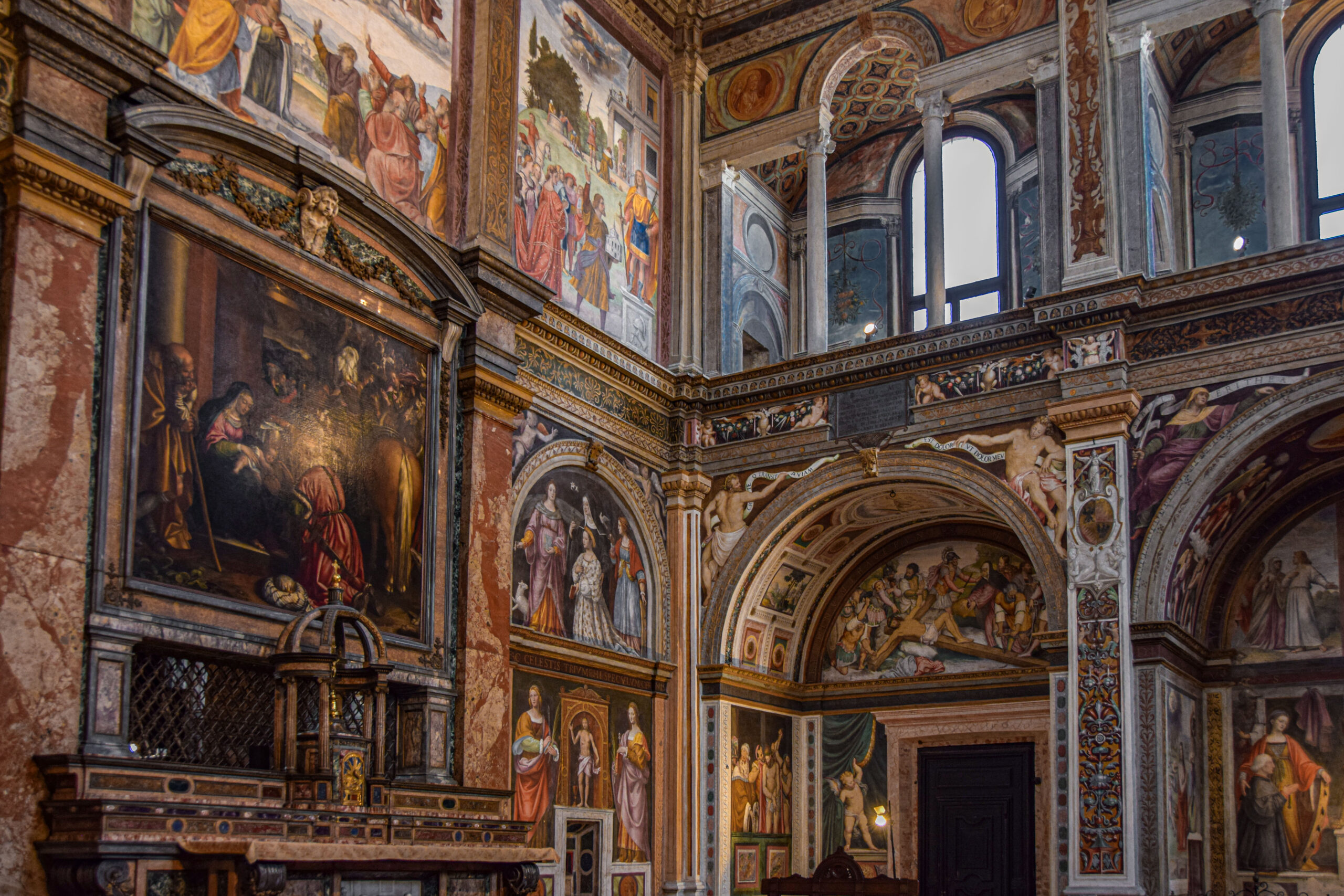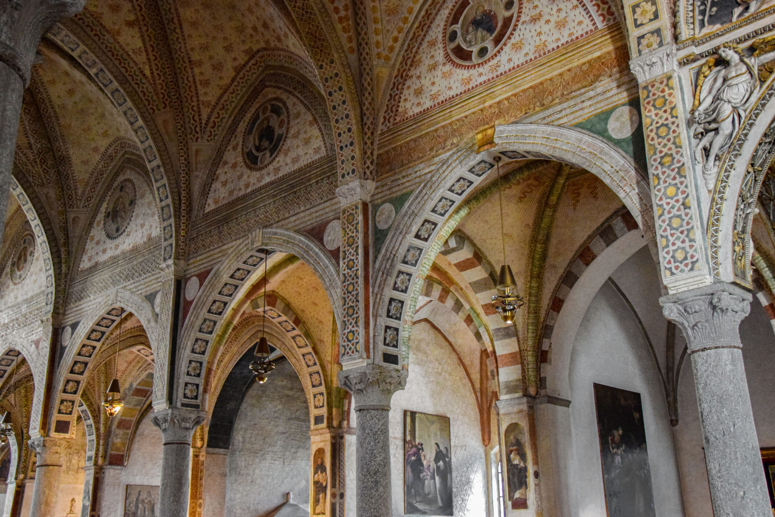Le dernier arrêt s’effectue à l’incroyable église Saint-Maurice. Je pense n’avoir jamais vu d’églises avec autant de fresques peintes laissant le regard émerveillé par cette explosion de couleurs. L’église San Maurizio est divisée en deux salless : la première accueillait tous les croyants pour assister à la messe tandis que les moines du couvent de Saint-Maurice se plaçaient dans la seconde partie à l’arrière de l’église. Si vous avez le temps, le Musée de l’archéologie situé juste à côté vaut aussi le coup d’œil.