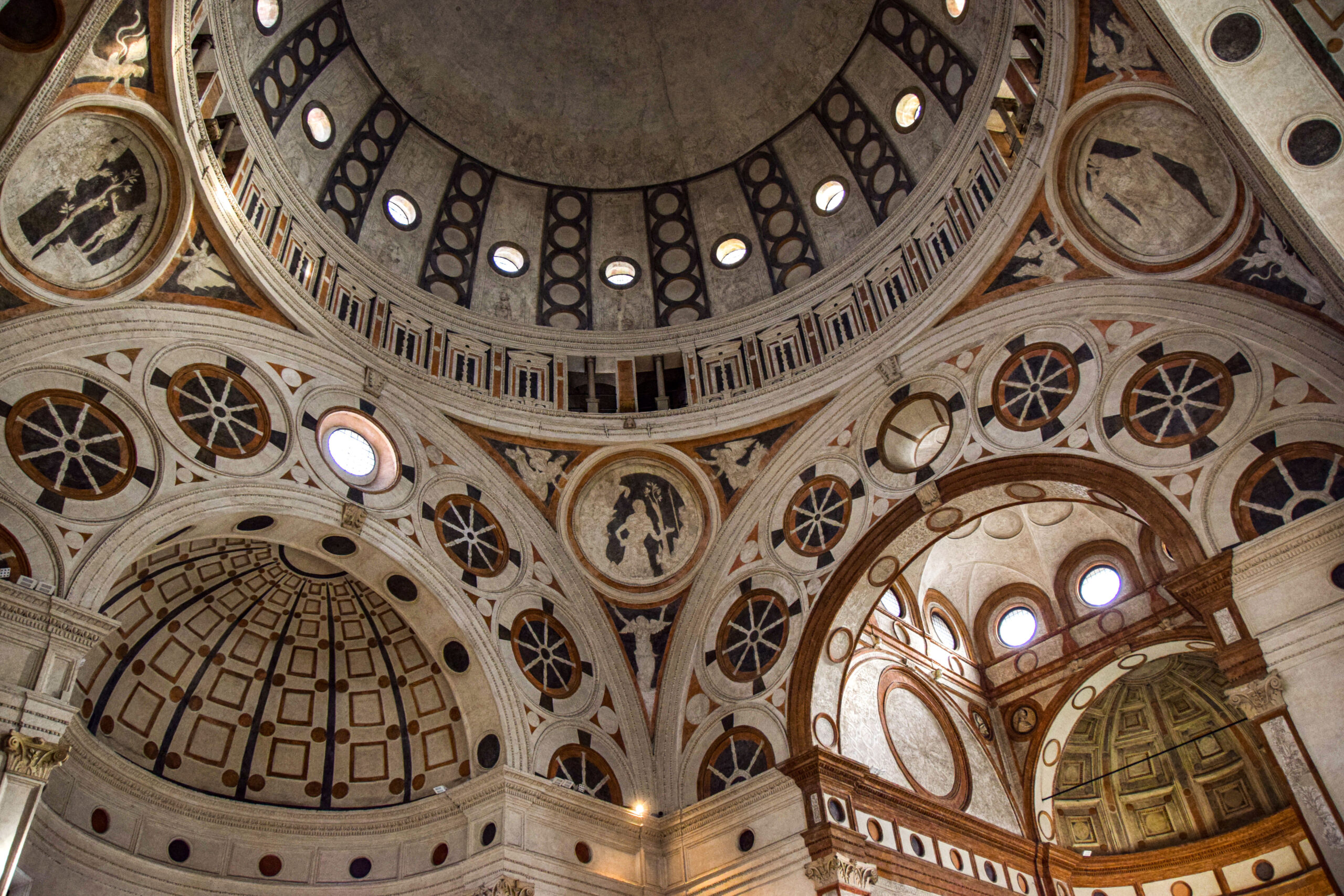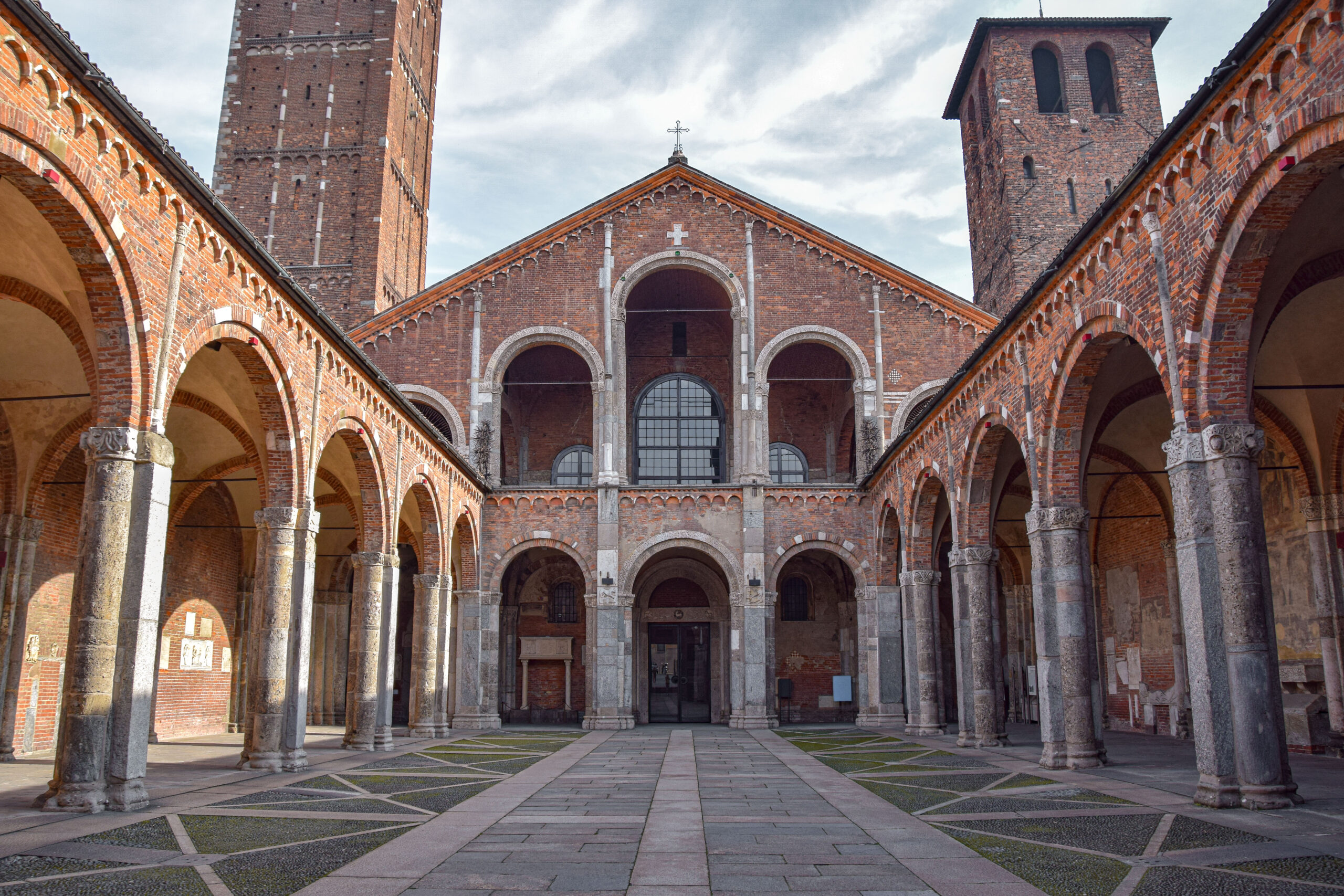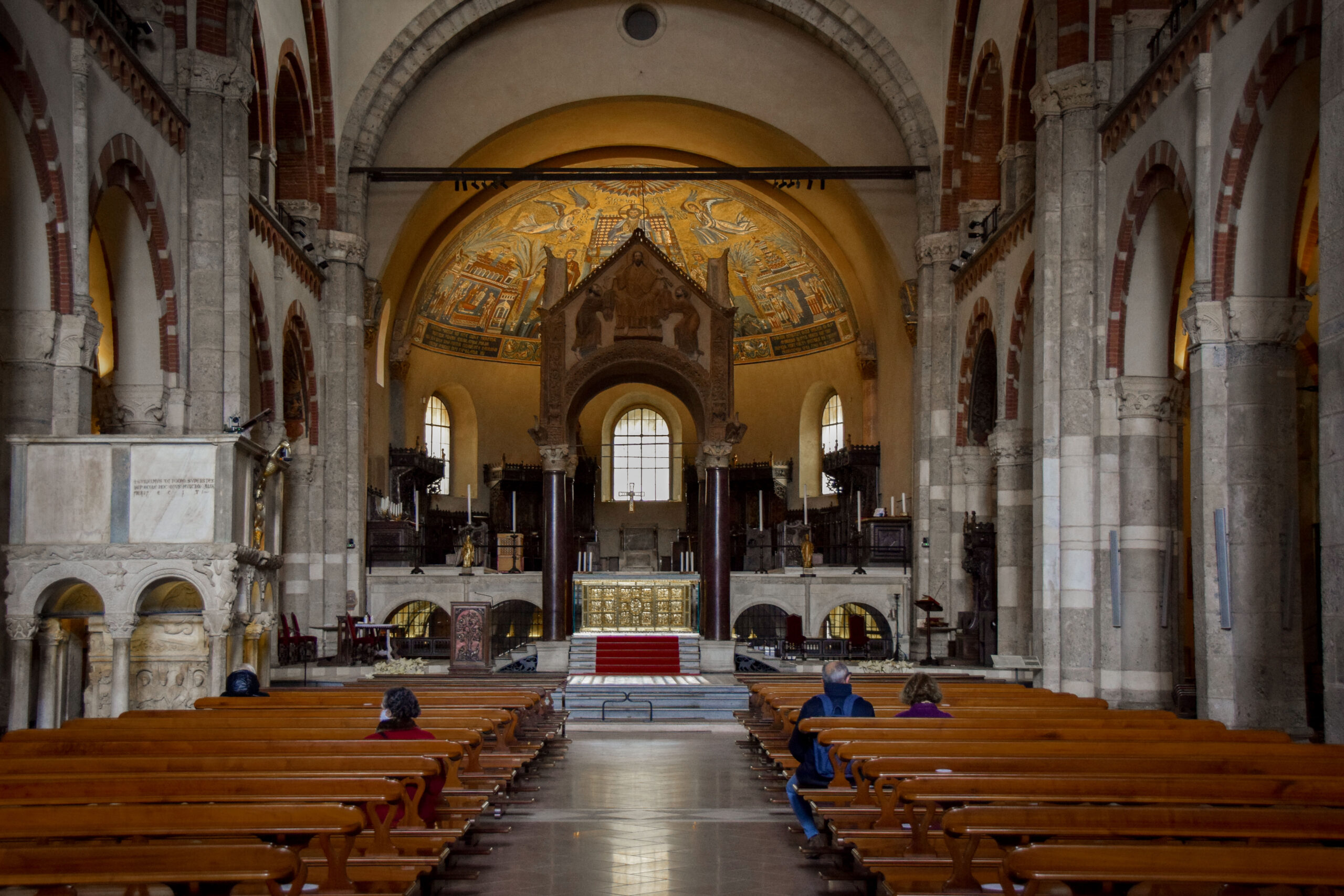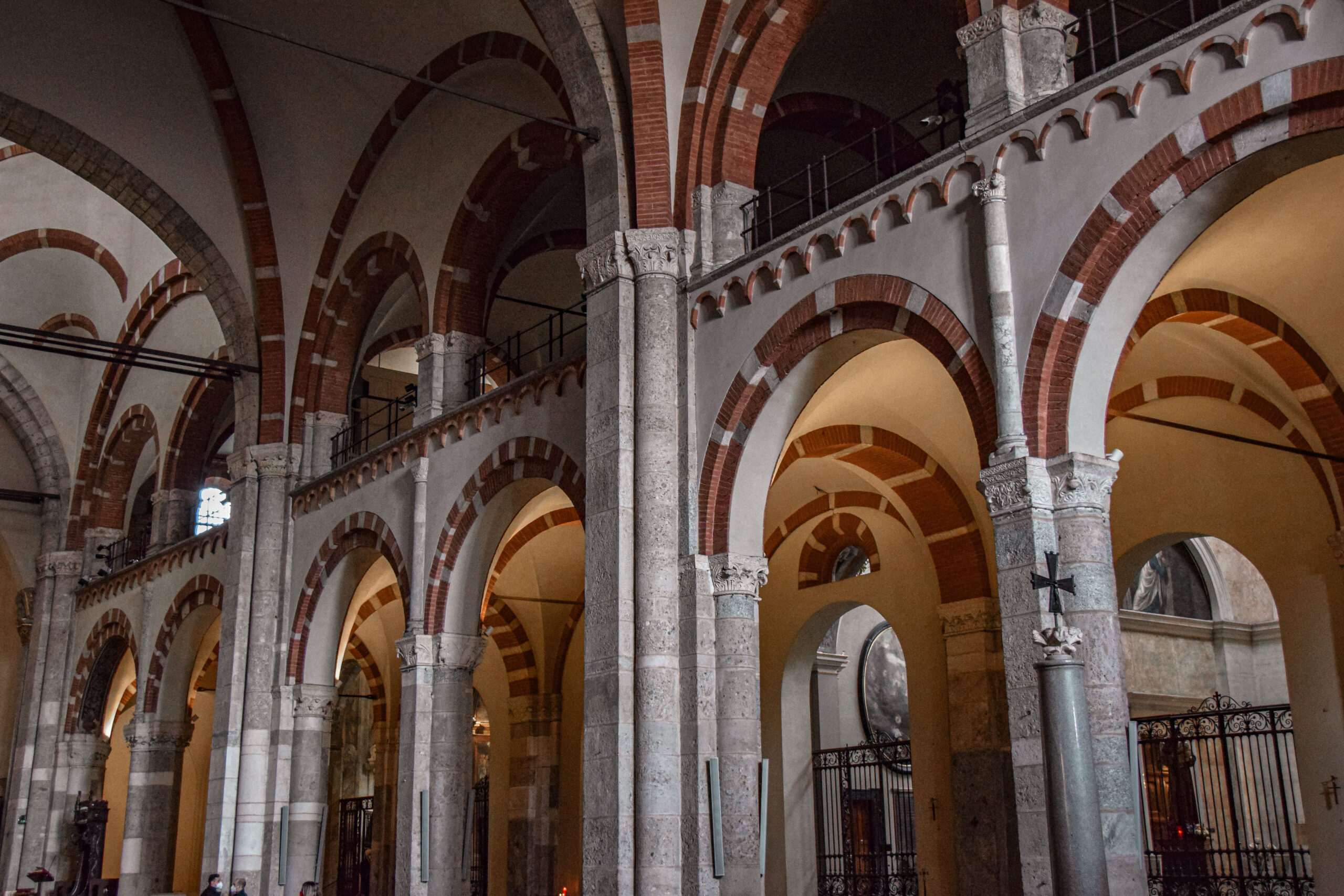 Pour continuer dans les édifices religieux immanquables de Milan, je me dirige à présent vers la Basilique Saint-Ambroise (Basilica di Sant’Ambrogio). L’extérieur est peu commun car surmonté de deux colonnes de part et d’autre de la nef principale. L’intérieur renferme entre autres une très belle coupole dorée au-dessus de l’autel, le squelette de Saint-Ambroise dans la crypte et quelques autres curiosités archéologiques.