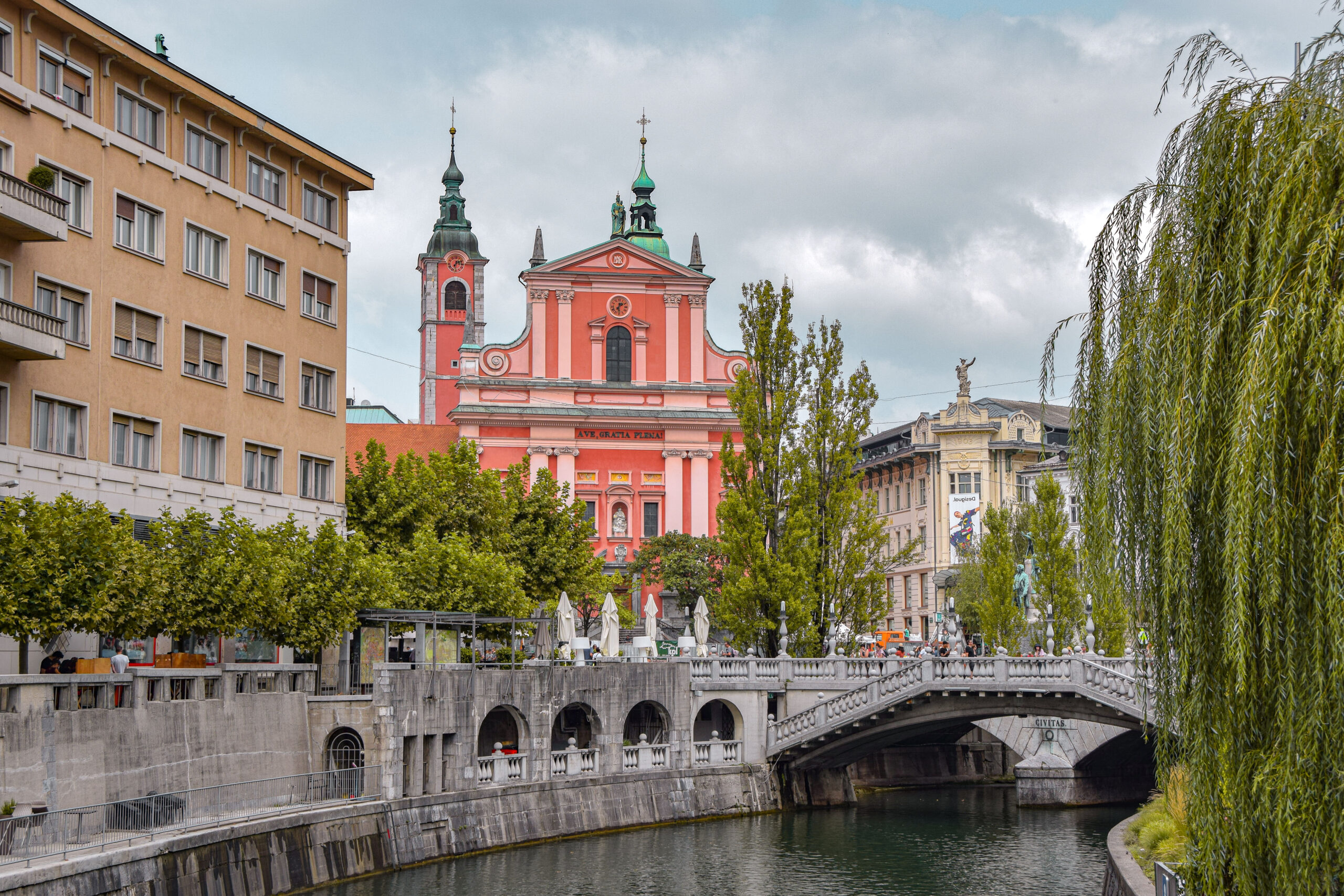 C’est dans le Staro Mesto (vieille-ville) de Ljubljana que se concentre toute l’effervescence et tout le charme de la ville. Je commence par me rendre sur la Presernov Trg (“Place Presernov”) sur laquelle on retrouve l’emblématique et si particulière église franciscaine, reconnaissable à ses façades aux nuances de roses. Face à l’église, se trouve le fameux triple-pont conçu par Joze Plecnik. La ville est en effet traversée par la rivière Ljubljanica et possède de nombreux ponts qui la chevauchent. De l’autre côté du triple-pont, on rejoint la Mestni Trg (“Place de la ville”) et son hôtel de ville en traversant les rues colorées de la vieille-ville.