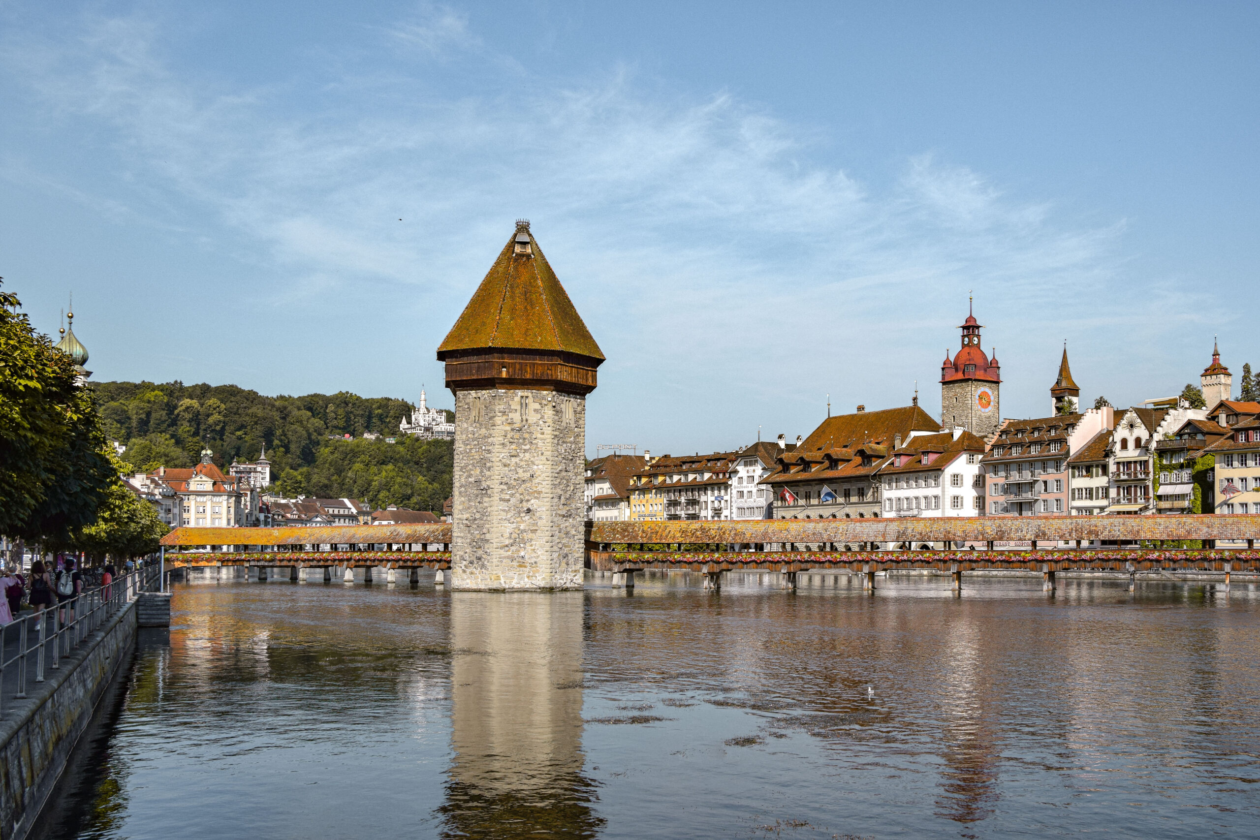 Impossible de passer à côté du pont de la chapelle reconnaissable à sa toiture en bois et à sa tour en pierre moyenâgeuse. Véritable emblème de la Lucerne, il est pris d’assaut par les touristes qui viennent chercher la photo parfaite avec comme toile de fond les façades de la vieille-ville et la rivière Reuss qu’il enjambe. En traversant le pont, levez la tête pour remarquer les panneaux de bois peints représentant des épisodes de l’histoire de la ville. Je vous conseille d’arriver tôt afin de profiter tranquillement du lieu sans la horde de monde.