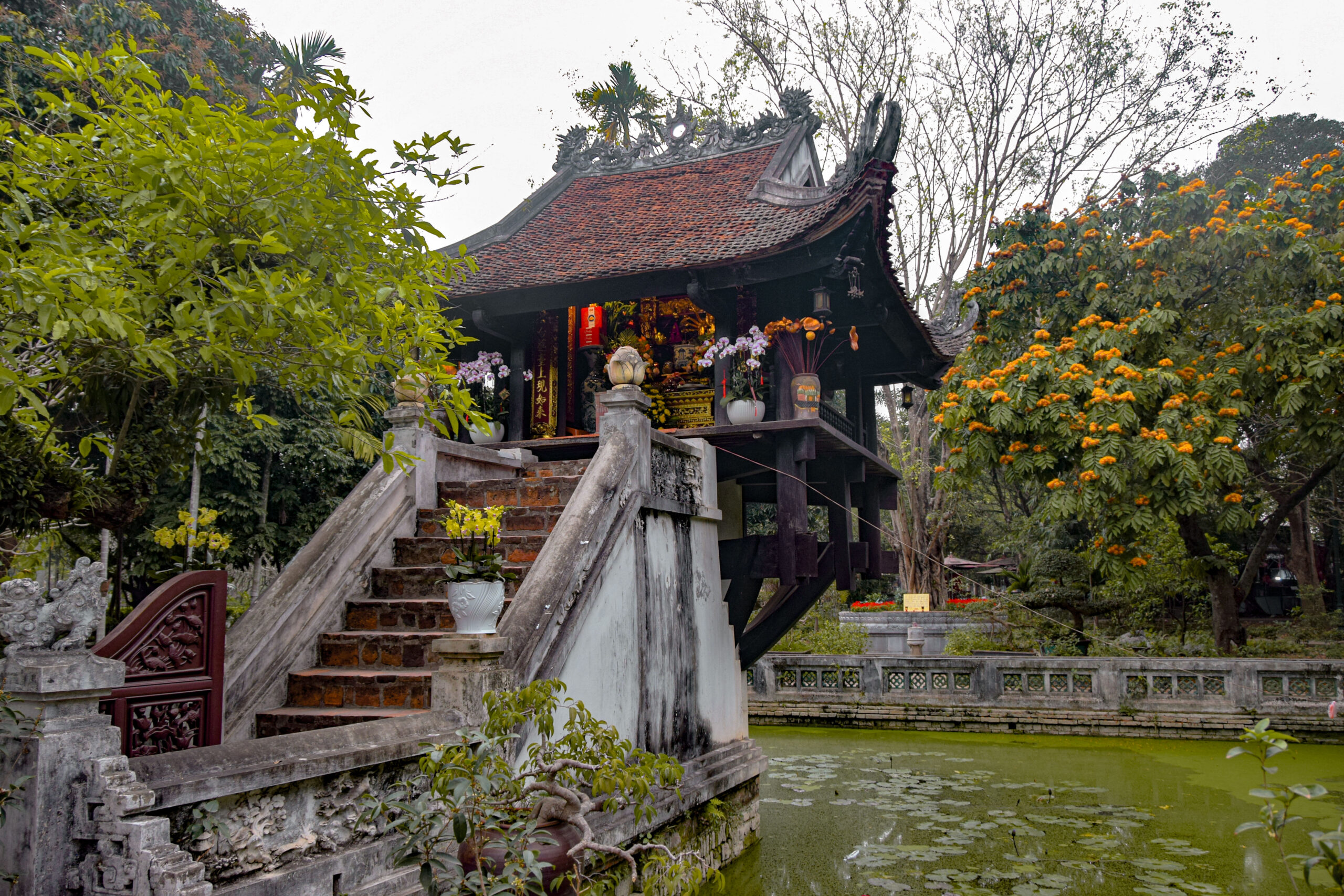 Selon la légende, l’empereur Ly Thai Tong a fait construire cette pagode au pilier unique en signe de gratitude à la déesse de la Miséricorde. En effet, l’empereur, qui régna de 1028 à 1054, ne parvenait pas à avoir d’enfants et fit un rêve dans lequel cette déesse assise sur un lotus au milieu d’un étang lui apporta un nouveau-né. Quelques temps plus tard, l’empereur épousa une jeune femme qui lui donna un fils. Pour la remercier, il ordonna la construction de cette pagode qui voit le jour en 1049. Posée comme un lotus qui flotte sur l’eau, cet édifice fut par la suite détruit par les français en 1954 avant d’être reconstruit sans sa forme quasi d’origine (le pilier qui soutient la structure était initialement en bois et non en béton) à la demande d’Ho Chi Minh. La pagode est ouverte tous les jours de 8h à 17h.