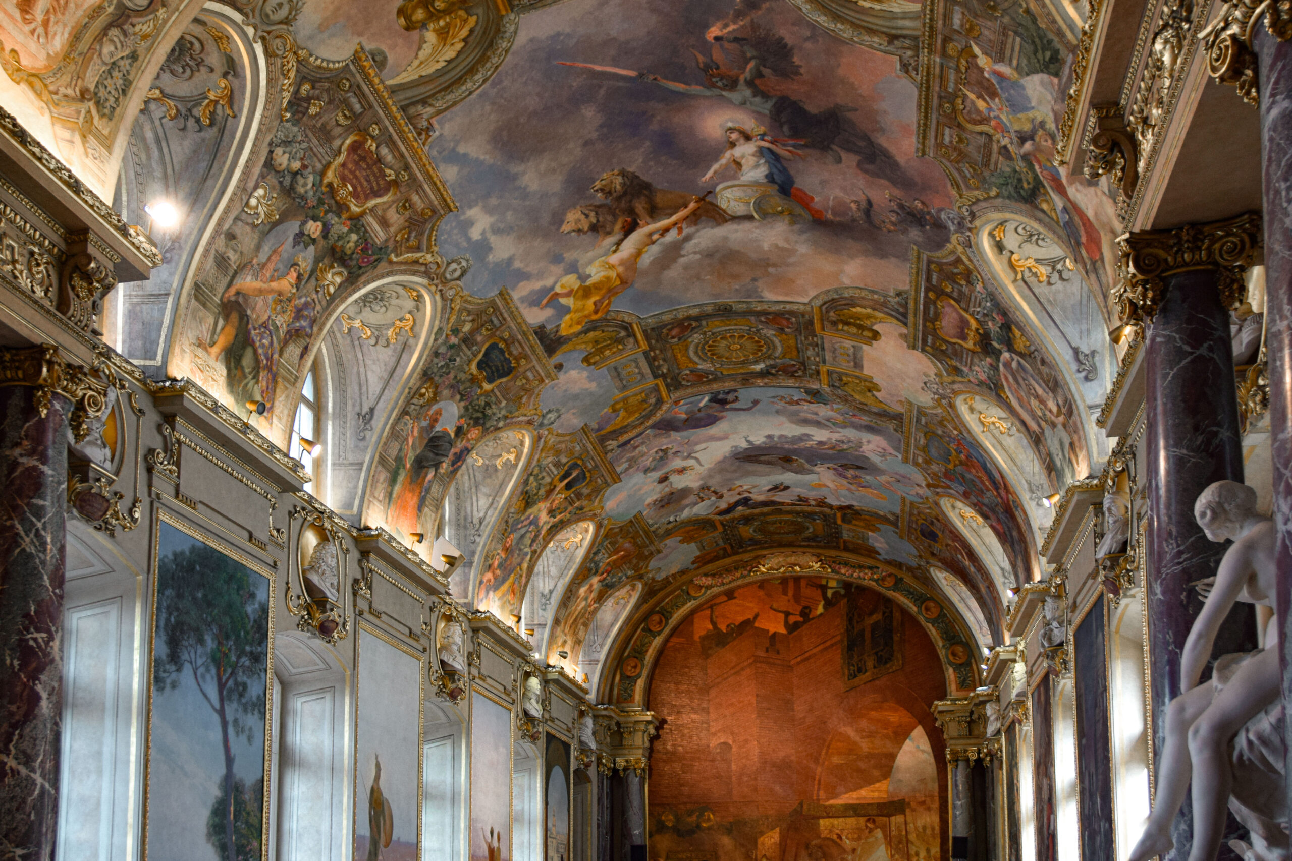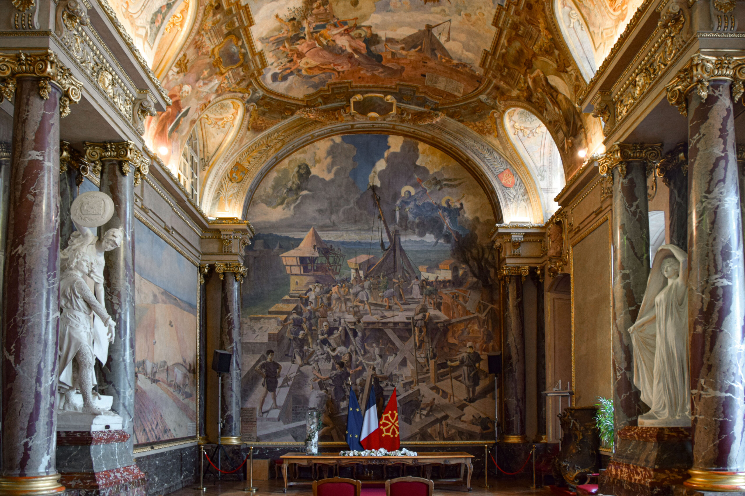 À l’intérieur, le Capitole abrite à la fois l’Hôtel de Ville et le Théâtre du Capitole, l’une des plus anciennes scènes lyriques de France. Mais c’est surtout dans la Salle des Illustres que l’on mesure l’ampleur du patrimoine toulousain : inspirée des galeries italiennes de la Renaissance, cette salle d’apparat est décorée de peintures allégoriques et de fresques exaltant les grands hommes de la ville.