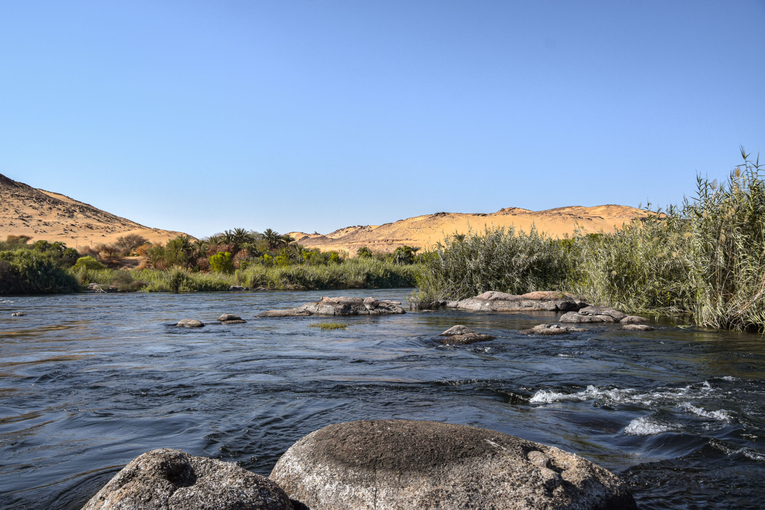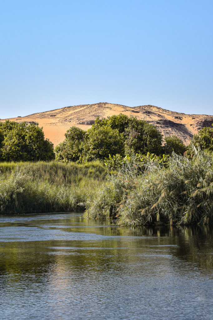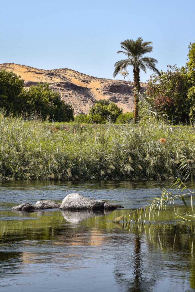 Depuis la felouque, on aperçoit également des dunes de sable qui descendent jusqu’à la rive, parfois ponctuée de quelques palmiers solitaires. C’est une Egypte différente de celle des pyramides : une Egypte nature et minérale, qui se contemple plus qu’elle ne se visite.