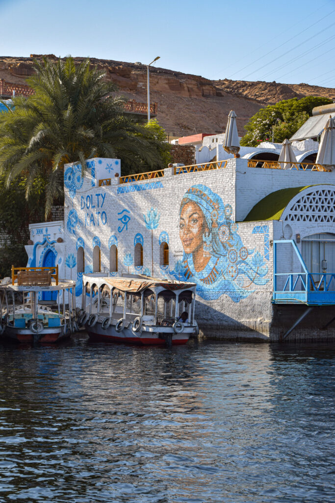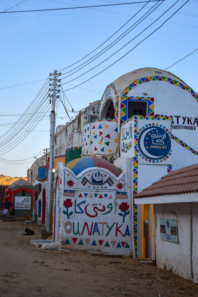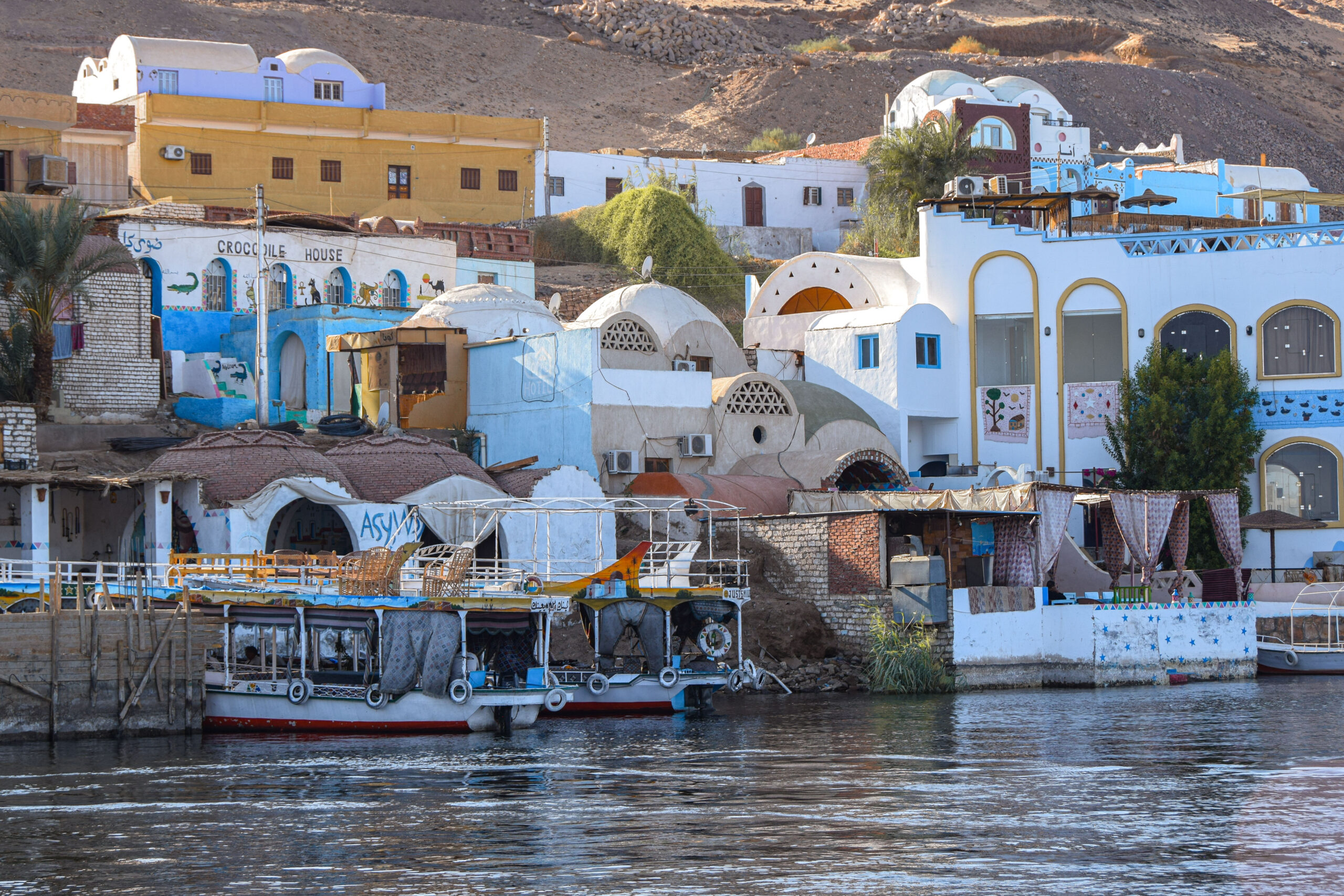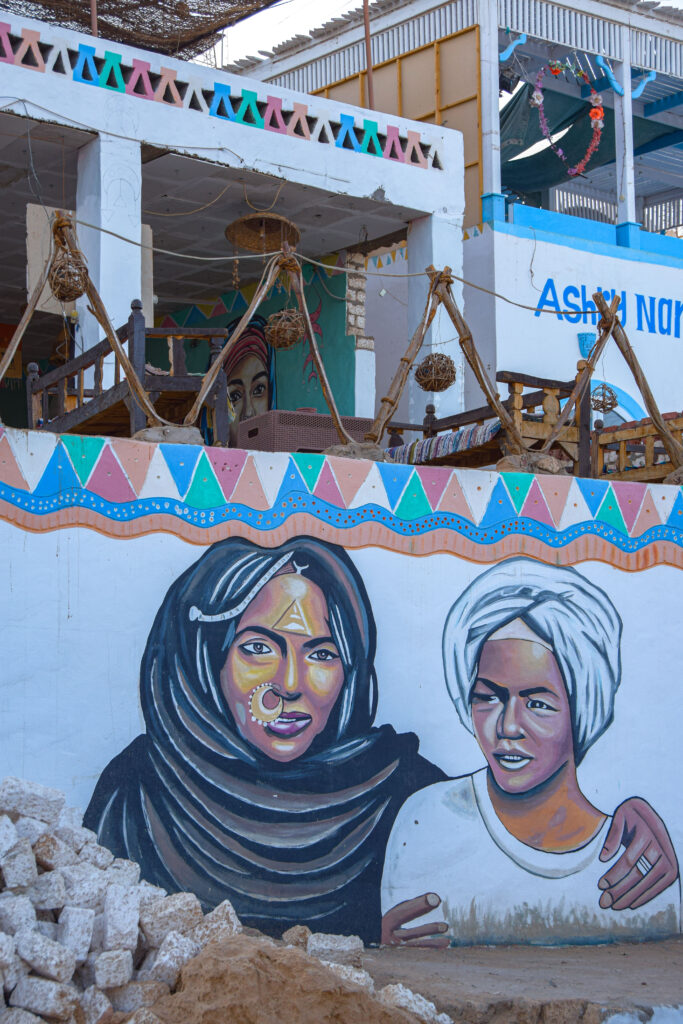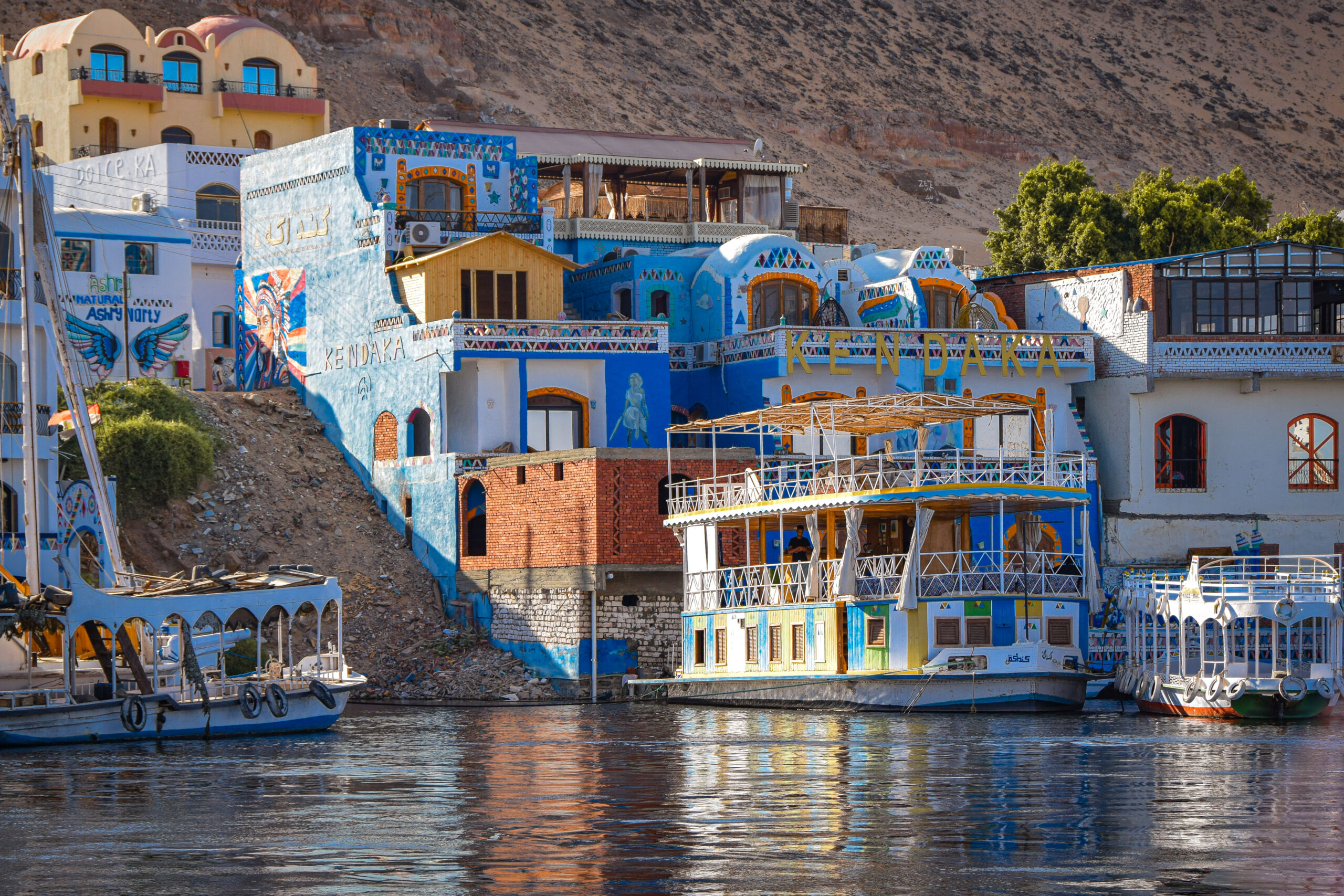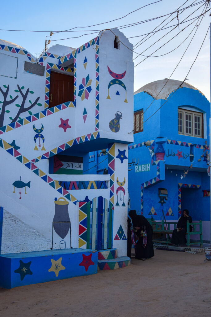 Un détour immanquable d’Assouan mène vers un village nubien, souvent accessible par bateau. Les maisons peintes de bleu, d’ocre et de rose s’ouvrent sur des cours décorées de fresques représentant crocodiles, palmiers et motifs géométriques. Bien qu’une grande partie des terres nubiennes furent englouties sous le lac Nasser, les nubiens ont su conserver leur identité : hospitalité, artisanat, musique rythmée et architecture reconnaissable.