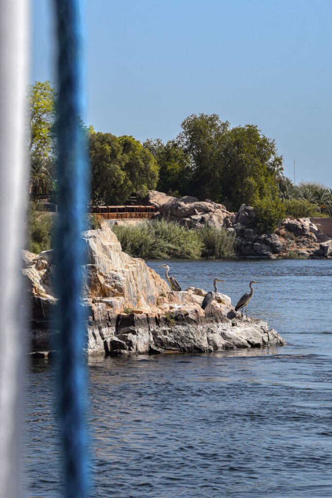 Sur les rives du Nil, un âne descend s’abreuver. Plus loin, un buffle patauge dans l’eau. Dans le ciel, on aperçoit des hérons cendrés, des martins-pêcheurs, parfois même des ibis. Entre les rochers, des amphibiens se reposent, et au crépuscule il paraît que les chauves-souris se prêtent à quelques vols nocturnes. Cette faune rappelle que le Nil est bien plus qu’un fleuve : c’est un véritable milieu de vie pour nombre d’espèces.