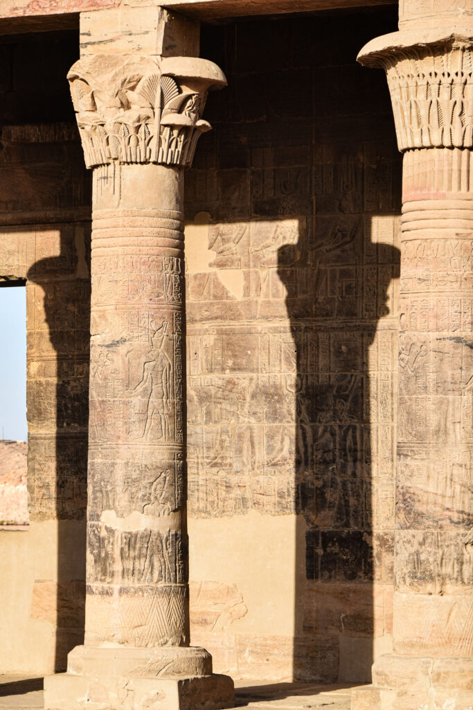 À quelques kilomètres d’Assouan, le temple de Philaé, dédié à la déesse Isis, est l’un des sites les plus envoûtants de ce voyage. Édifié principalement sous les dynasties ptolémaïques (3è-1er siècle av. J.-C.), il devint un centre religieux majeur du culte d’Isis, déesse-mère et magicienne, dont l’influence s’étendit bien au-delà de l’Égypte jusqu’à Rome.