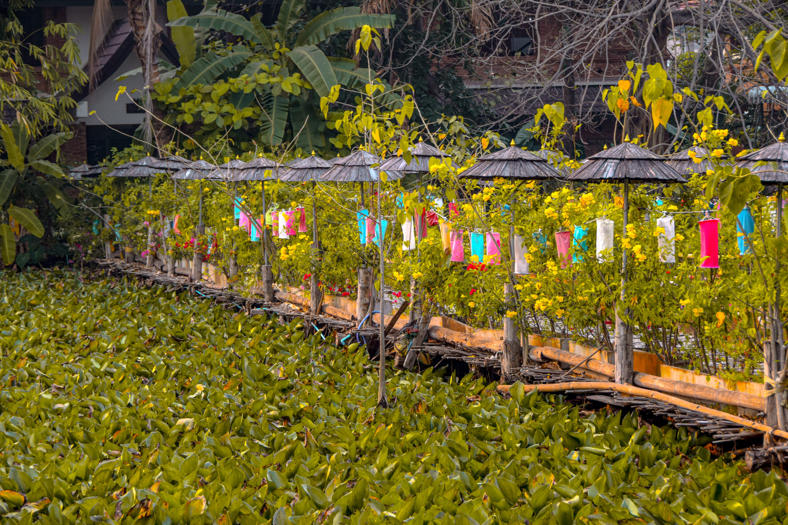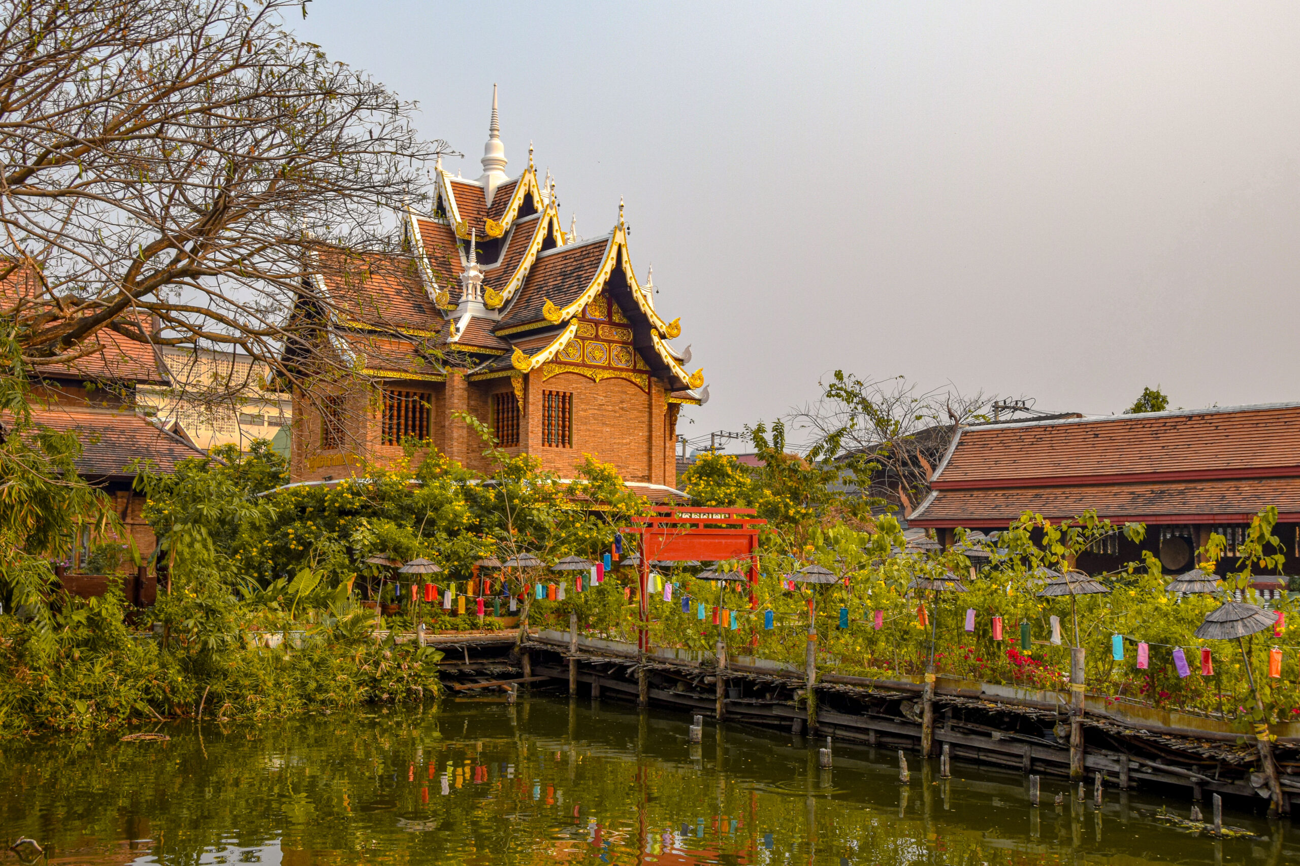 Peu fréquenté au sud de la vieille-ville, le Wat Jet Lin est pourtant un temple bien atypique de Chiang Mai. À première vue, il s’agit d’un temple construit comme tous les autres avec son chedi ancien de style mon-dop et son viharn abritant une statue de Bouddha assis recouvert d’or. Toutefois, c’est dans le jardin secret situé derrière que la magie opère. On y découvre alors un étang paisible recouvert de nénuphars et un petit pont en bambou posé dessus que l’on peut traverser. Chaque côté du pont est décoré de lanternes multicolores et recouvert de végétation.