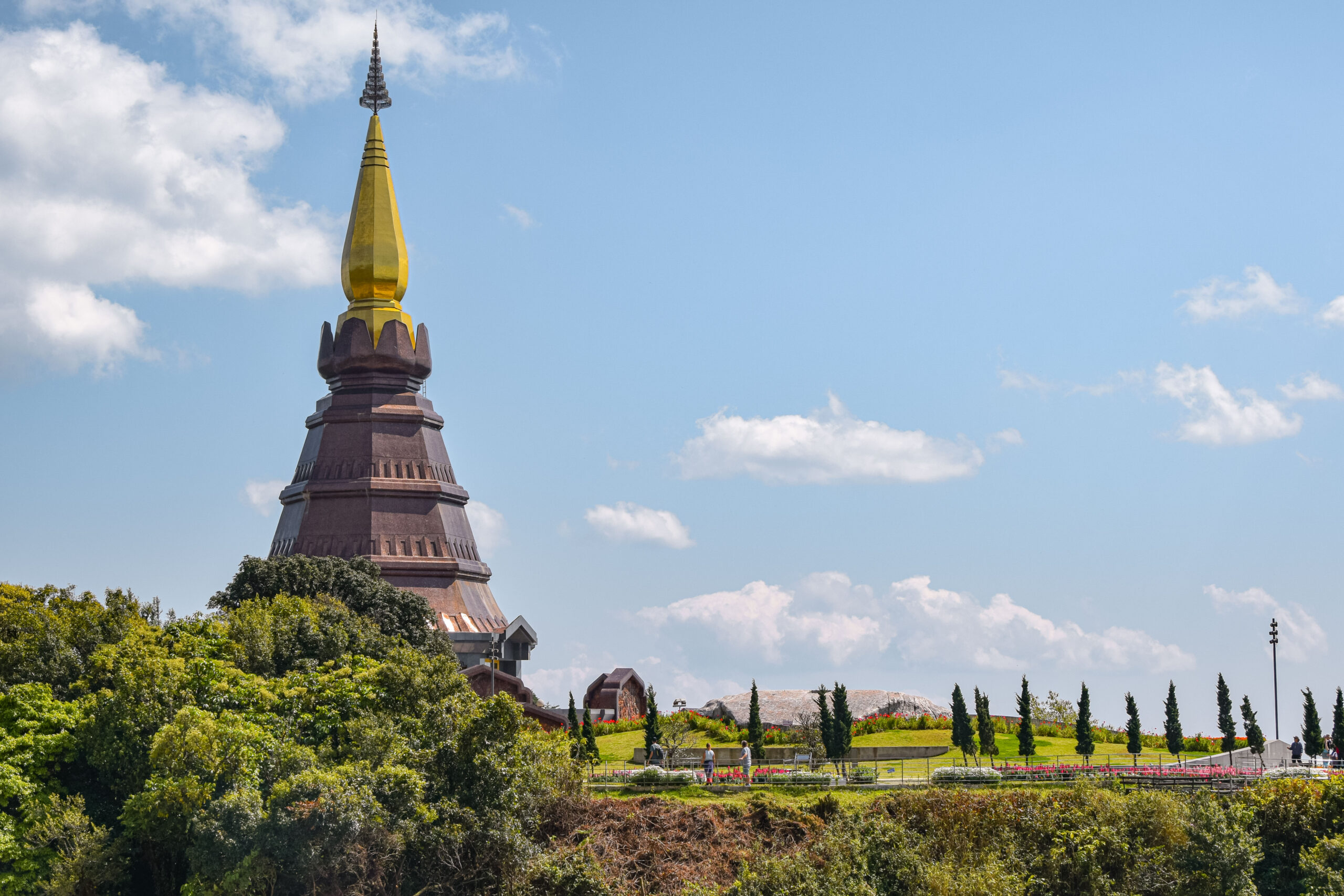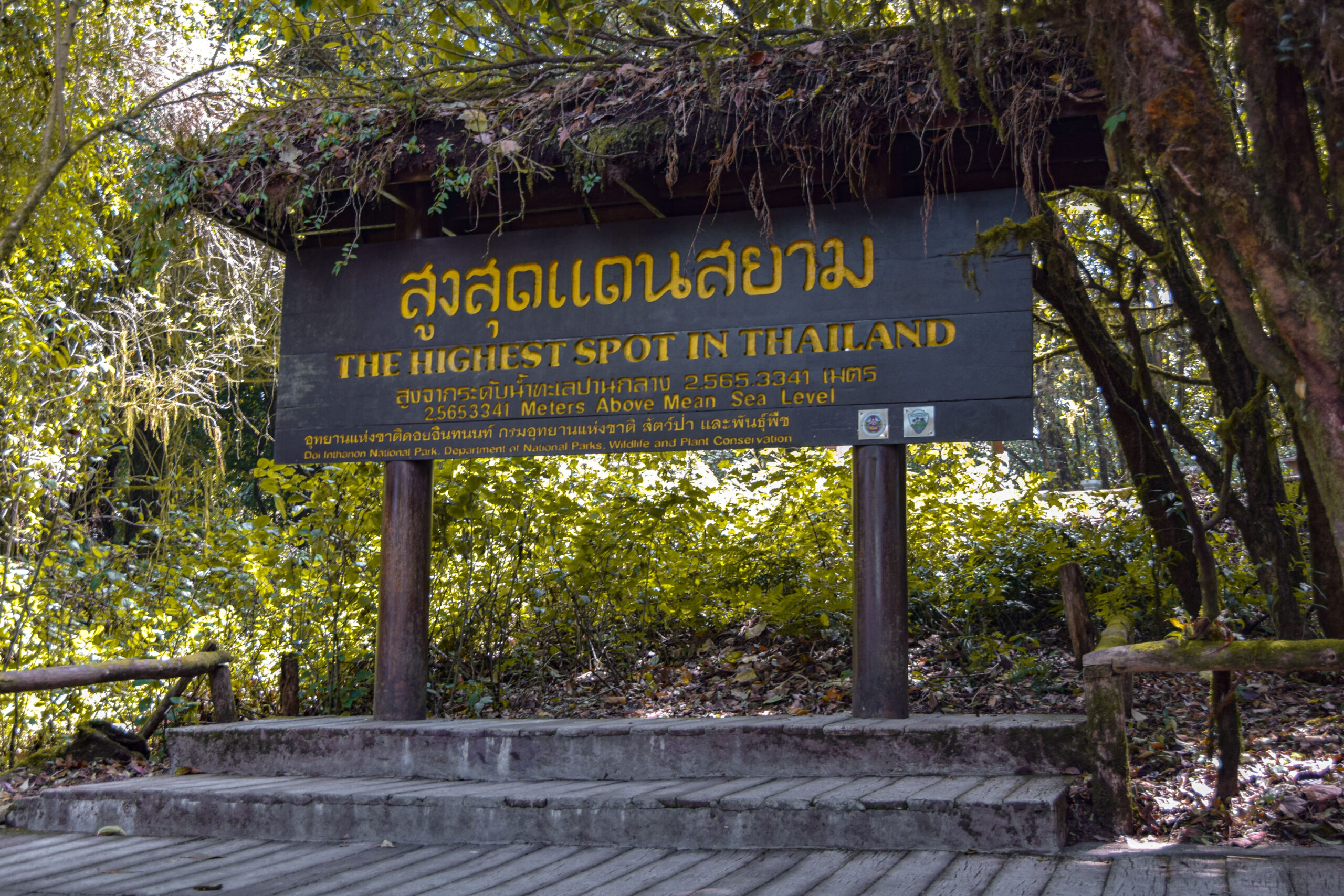 Le premier point d’arrêt d’une journée au parc national de Doi Inthanon est certainement le plus haut sommet de la Thaïlande sobrement indiqué par un panneau de bois. Bien que ce soit le point le plus haut du pays, il n’y a en réalité aucune plateforme d’observation ou de vue dégagée. Pour s’y rendre, il faut aller en direction de la station radar en voiture ou à vélo (l’accès à pied n’est plus possible) puis marcher sur un sentier de quelques dizaines de mètres seulement. Sur le chemin, on peut admirer le sanctuaire dédié à Inthawichayanon, l’un des derniers rois du royaume Lanna et dont le nom a inspiré celui du parc national de Doi Inthanon.