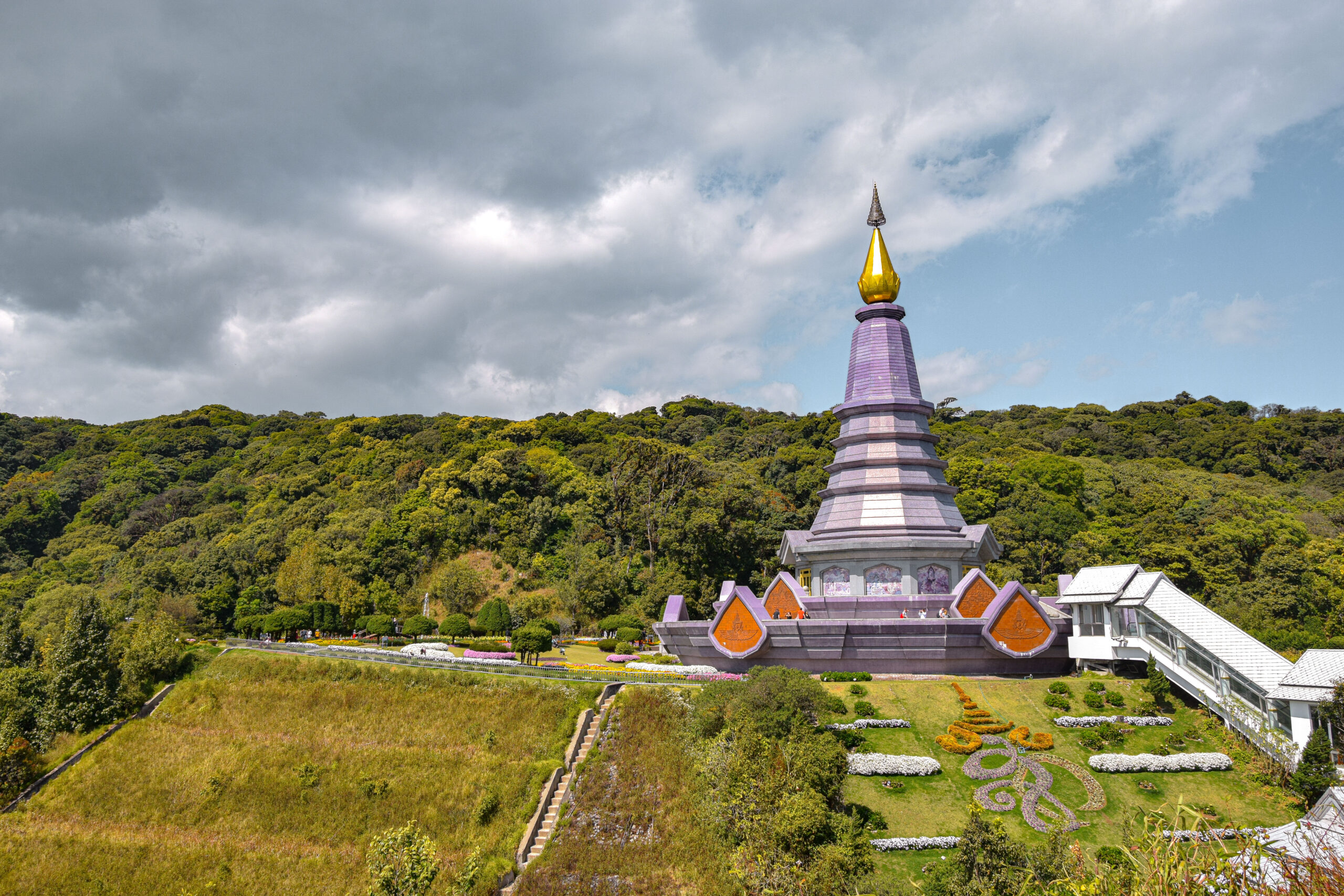 Si on les appelle vulgairement les pagodes jumelles, leurs vrais noms sont Phra Mahathat Napha Methanidon et Phra Mahathat Naphaphon Bhumisiri. La première a été construite en 1987 pour célébrer les 60 ans du défunt roi Rama IX tandis que la seconde a été érigée en 1992 pour célébrer les 60 ans de l’ancienne reine consort Sirikit. La pagode du roi est située près d’une terrasse panoramique d’où l’on peut profiter d’une vue dégagée sur le parc national. La pagode de la reine, reconnaissable à sa couleur violette, est entourée d’un vaste jardin fleuri. Le ticket d’entrée aux pagodes est de 100 bahts. Il faut se garer au parking en contrebas puis prendre la navette (gratuite) qui dépose au pied des pagodes.