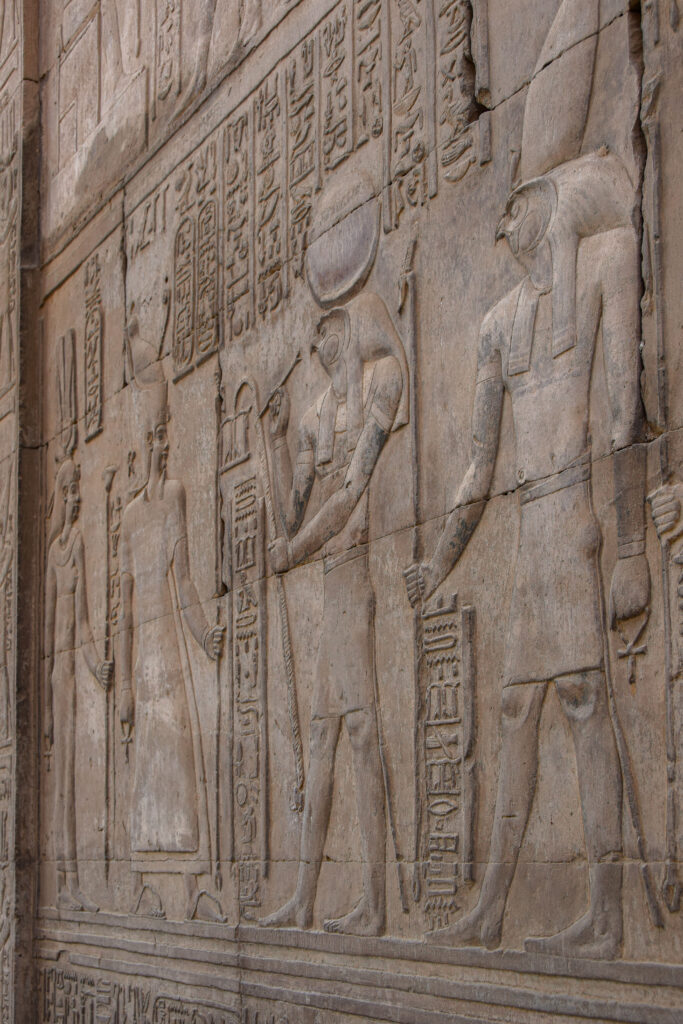 - Sur la partie nord, c’est le dieu Horus l’Ancien (Haroëris), représenté sous forme de faucon, qui régnait. Protecteur des pharaons et incarnation de l’ordre cosmique, il apportait un contrepoint solaire et bienveillant au caractère inquiétant de Sobek.