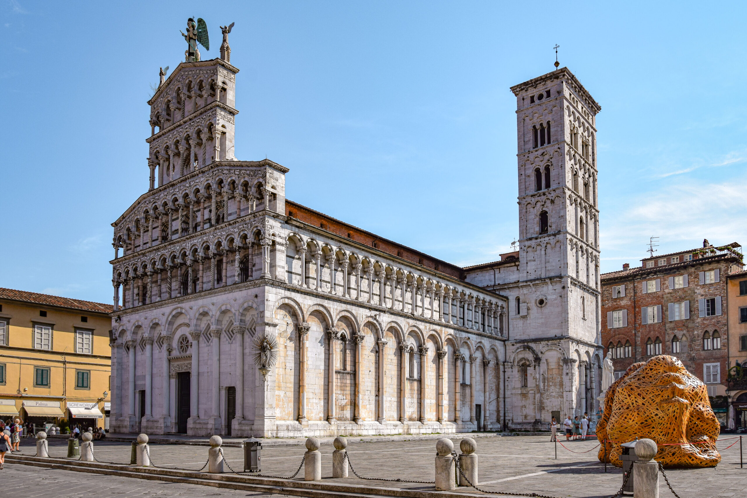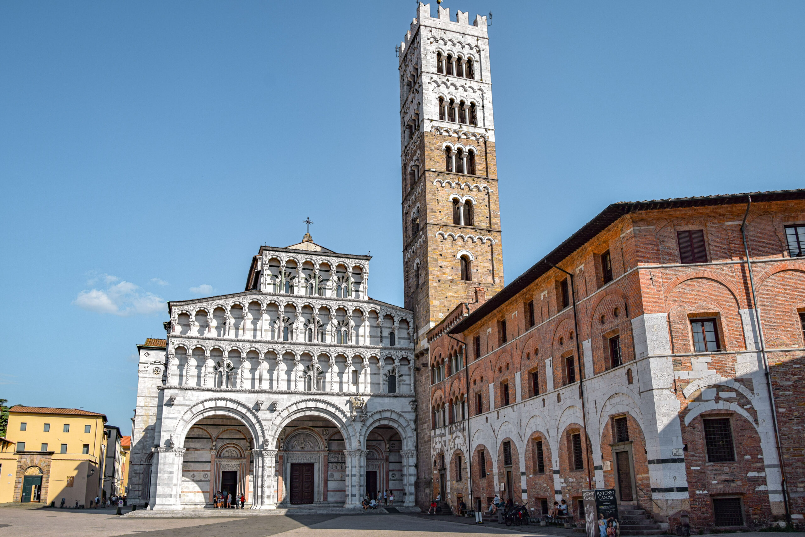 Situé en plein cœur de la ville, nous commençons notre visite par le Duomo de San Martino, cathédrale emblématique de Lucques et chef-d’œuvre de l’art roman toscan. Fondée au 6ème siècle, mais entièrement reconstruite au 11ème siècle, cette cathédrale est le témoin de la richesse et de l’influence de Lucques à l’époque médiévale. Sa façade asymétrique, ornée d’élégantes arcades et de sculptures en marbre, attire immédiatement l’attention. Le contraste entre le blanc du marbre et les bandes sombres zébrées ajoute également à son caractère unique. Parmi les nombreuses œuvres d’art qui décorent la façade, on peut admirer des bas-reliefs représentant des scènes bibliques et des figures mythologiques, œuvre du célèbre sculpteur Nicola Pisano.