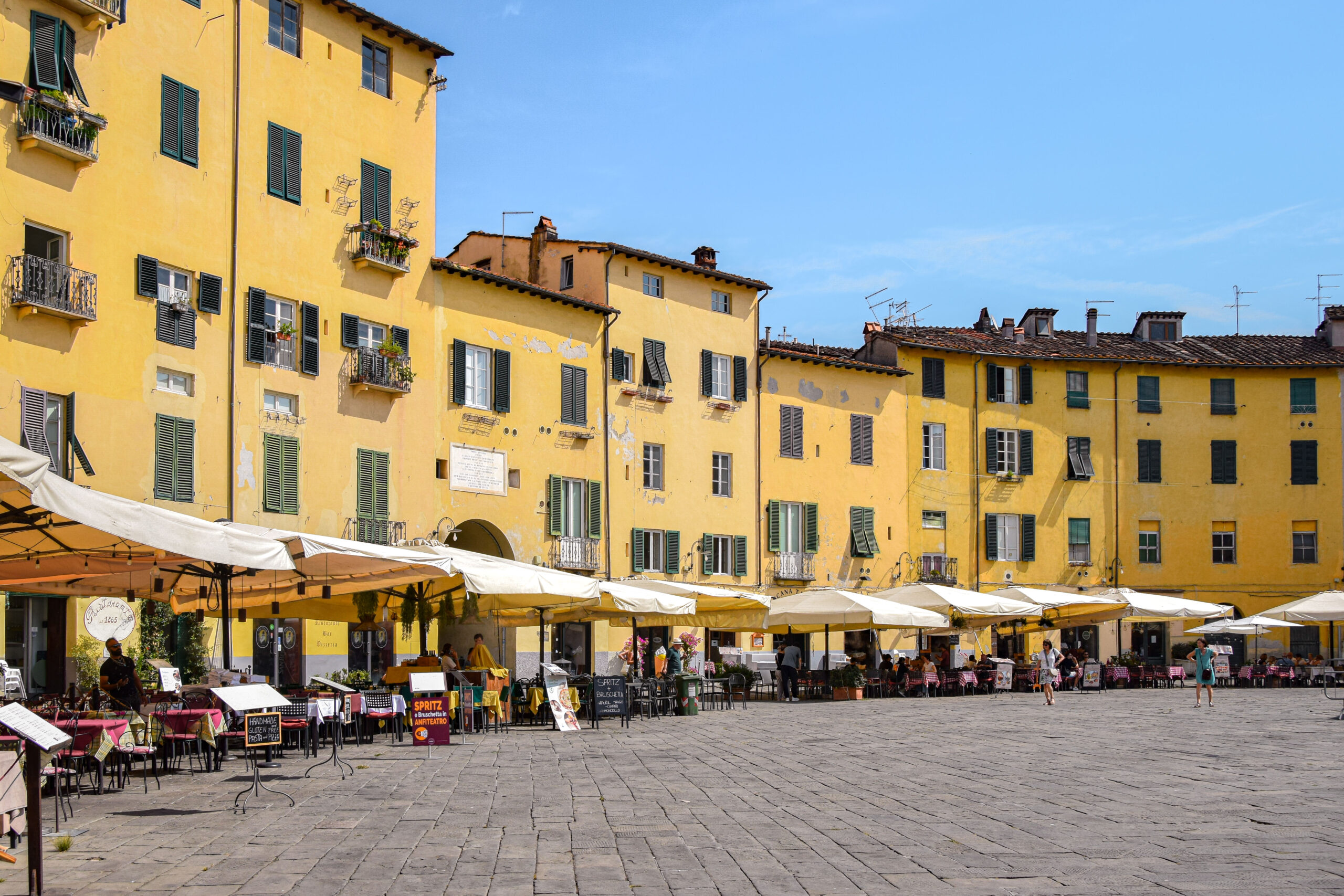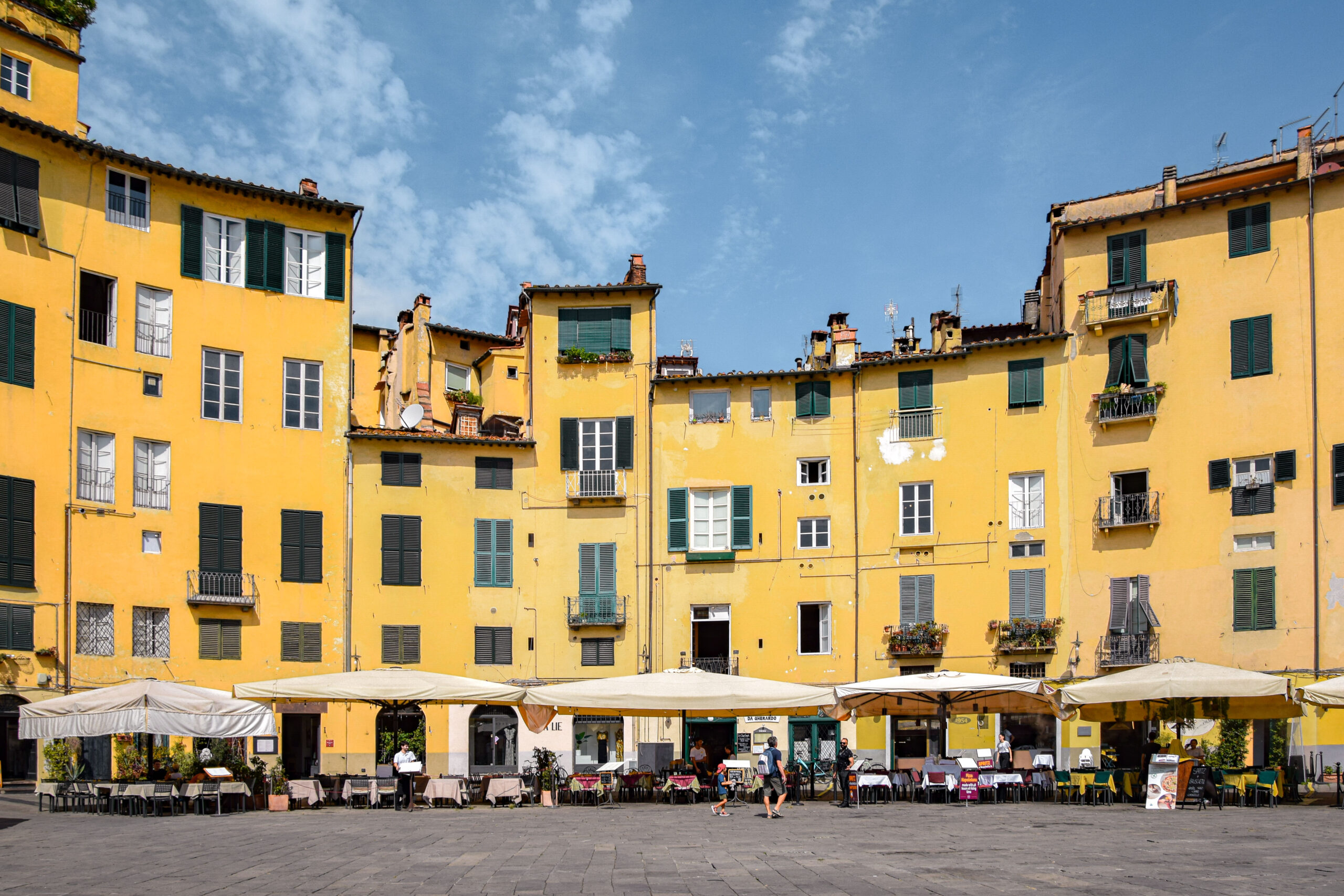 C’est sous une chaleur de plomb que nous décidons de nous rendre sur la place de l’Amphithéâtre pour une pause bien méritée. Cette place emblématique tire son nom et sa structure particulière des vestiges d’un amphithéâtre romain construit au 1er ou 2ème siècle après J.-C., alors que Lucques était une colonie romaine florissante. À l’époque, l’amphithéâtre pouvait accueillir jusqu’à 10 000 spectateurs, venus assister à des combats de gladiateurs, des spectacles ou d’autres événements publics. Aujourd’hui, la Piazza dell’Anfiteatro est entourée d’immeubles aux façades colorées, typiques de l’architecture toscane, avec des fenêtres étroites et des balcons fleuris. On peut encore voir les arcs d’entrée originaux de l’amphithéâtre, qui servaient autrefois de passage pour les spectateurs et les artistes. L’un des aspects les plus intéressants de ce lieu est la manière dont la vie quotidienne s’est intégrée dans ce cadre historique : aujourd’hui, la place est un lieu animé, bordé de cafés et de restaurants, où touristes et habitants viennent se détendre, flâner ou se restaurer.