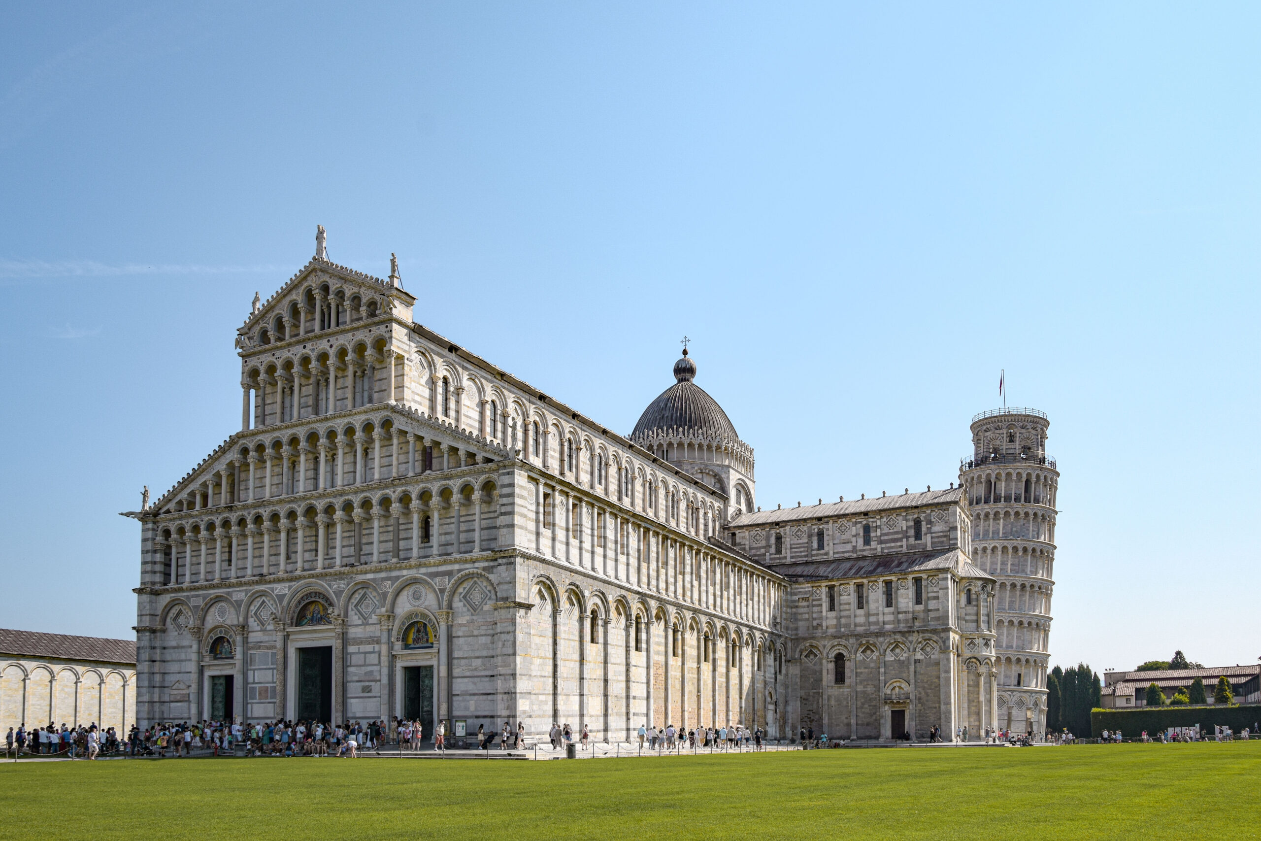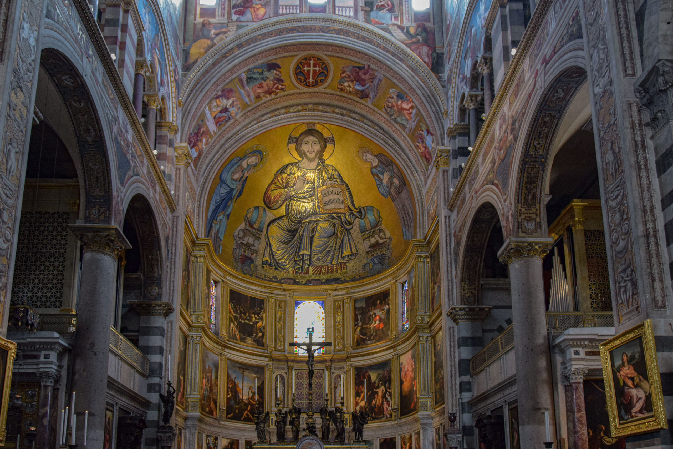 À côté de la tour, nous poursuivons notre visite vers la cathédrale (Duomo), un chef-d’œuvre de l’architecture romane pisane. Consacrée en 1118, elle incarne la richesse de Pise à son apogée maritime. Son intérieur, tout aussi impressionnant, est décoré de mosaïques dorées byzantines et d’un superbe plafond à caissons. Le portail en bronze et la façade, ornée de marbre et de colonnes, montrent l’alliance entre austérité romane et raffinement byzantin. La cathédrale se visite gratuitement.