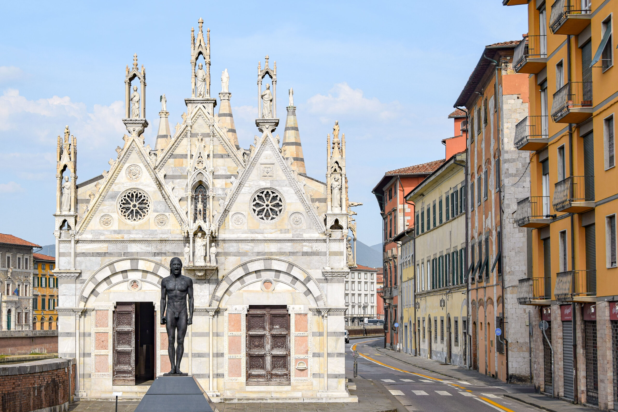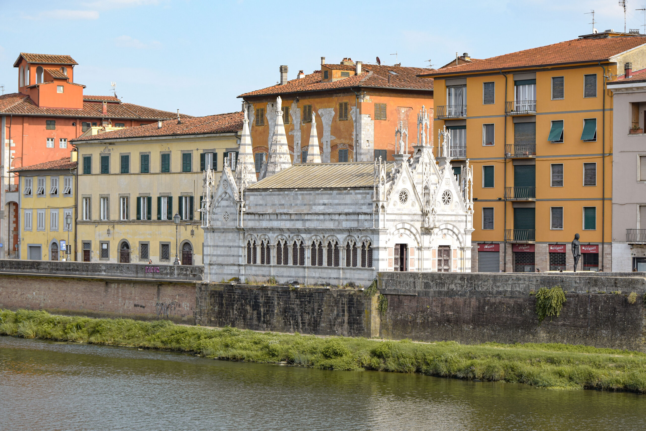 Un peu plus en aval des rives se trouve l’église Santa Maria della Spina, un bijou de l’architecture gothique pisan. Bien que modeste par sa taille, cette église du 13ème siècle se distingue par son décor extérieur finement sculpté en marbre et ses nombreuses statues qui ornent sa façade. Son nom, « della Spina », fait référence à une épine qui aurait appartenu à la couronne d’épines du Christ, et qui y aurait été conservée. Placée au bord même de l’Arno, l’église semble émerger des eaux.