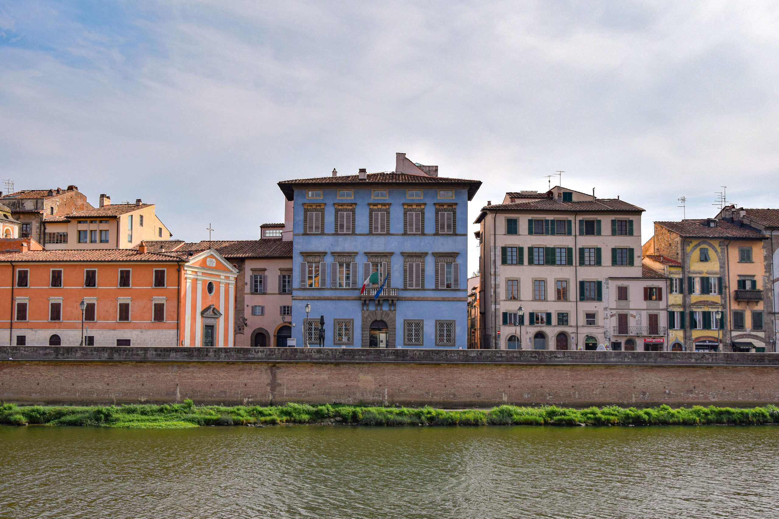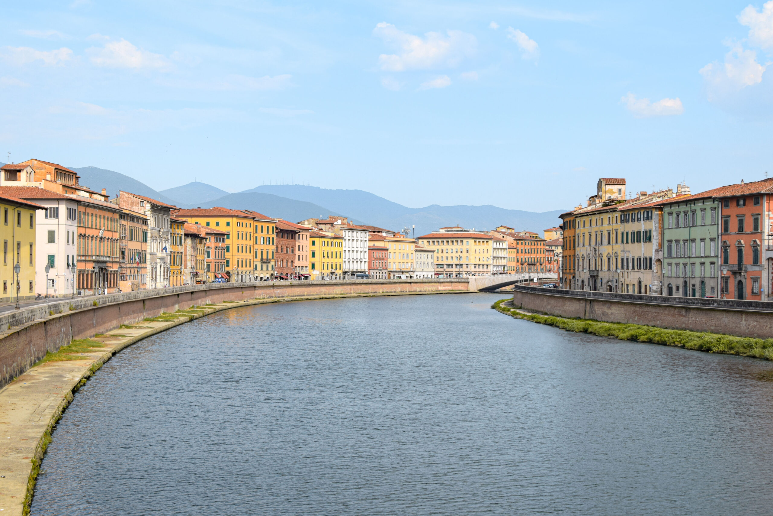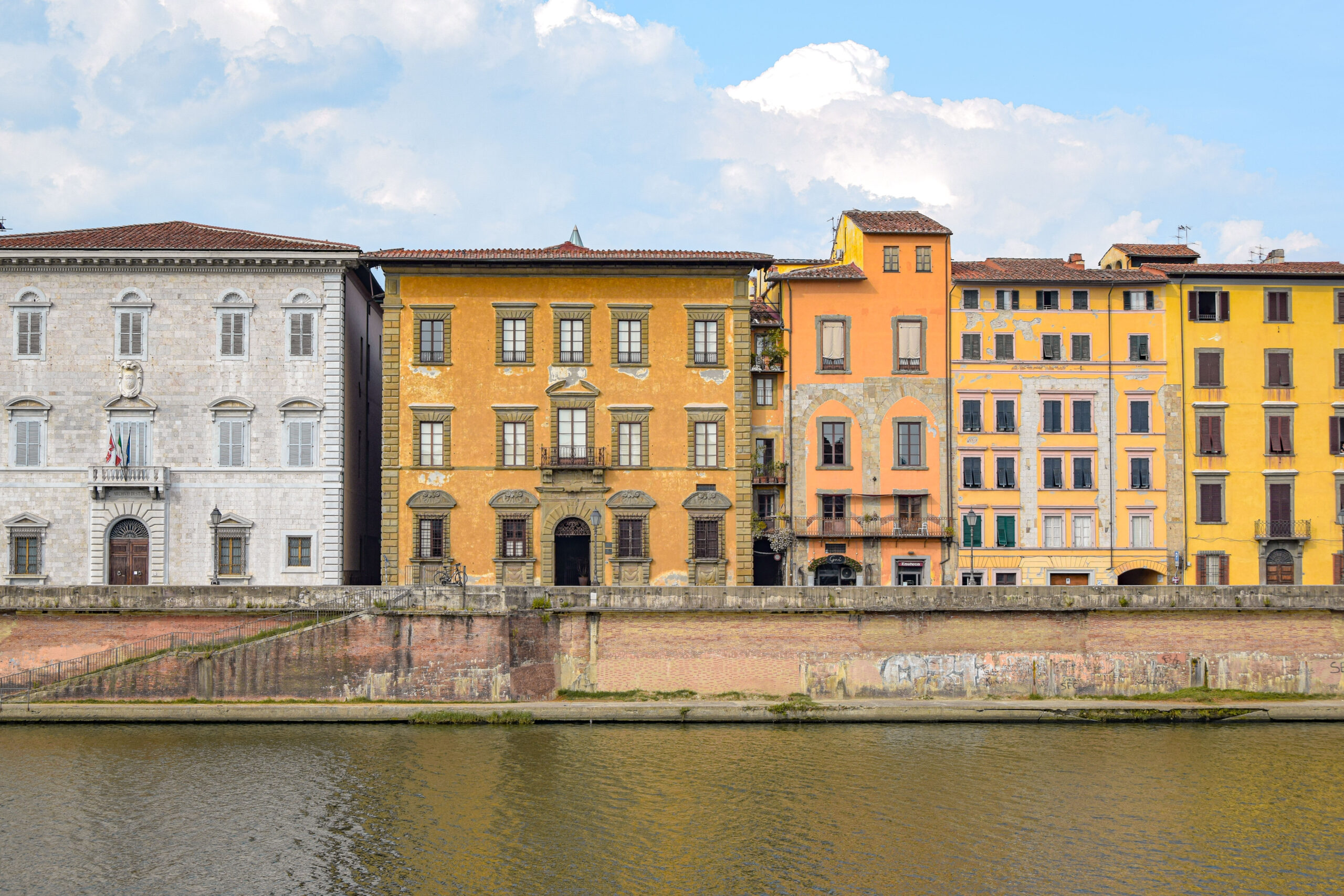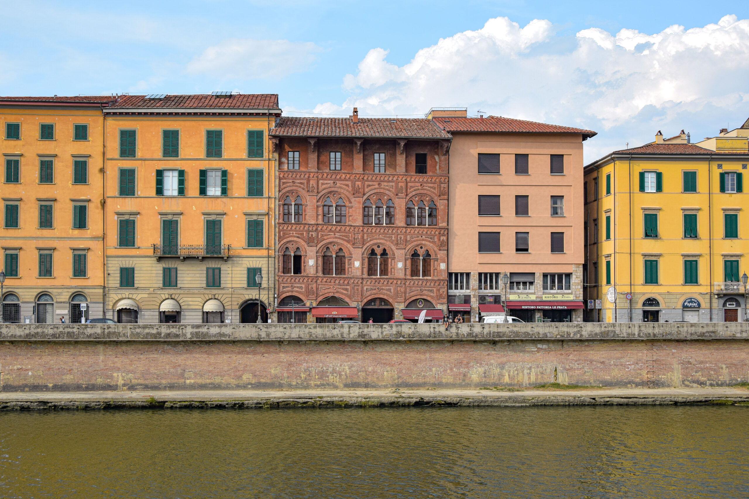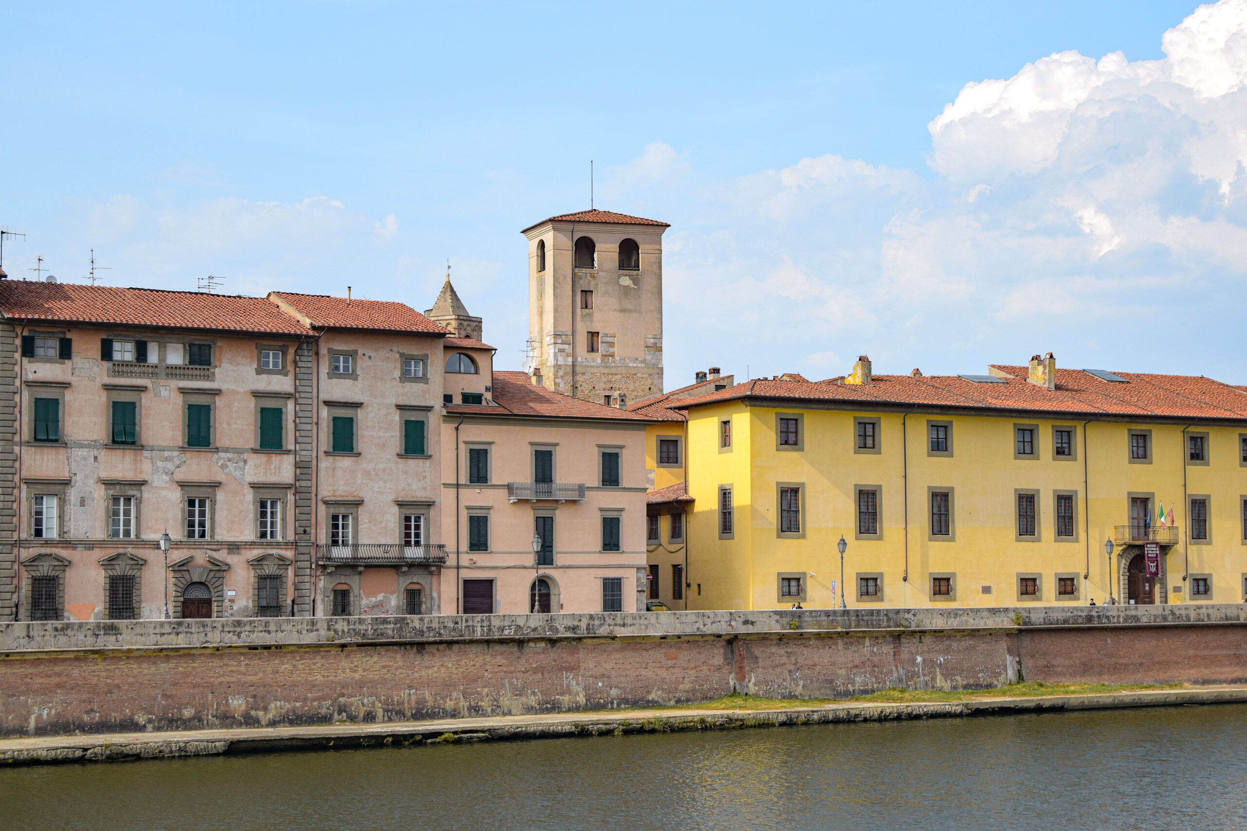 Après la place des Miracles, nous nous dirigeons sur les quais du fleuve plus au sud de Pise, là où les visiteurs se font rares et la vie locale redevient authentique. Les rives de l’Arno, qui traversent la ville d’ouest en est, offrent un panorama pittoresque et plein de charme, où l’architecture colorée et les monuments historiques se mêlent au fil du fleuve. Le long des quais, les façades des bâtiments se parent de teintes chaudes et éclatantes – jaunes, ocres, roses et rouges – créant une atmosphère à la fois paisible et vivante. D’anciens palais jalonnent les quais, rappelant l’importance de l’Arno dans l’histoire de Pise, en tant que voie de commerce et de transport au Moyen Âge.